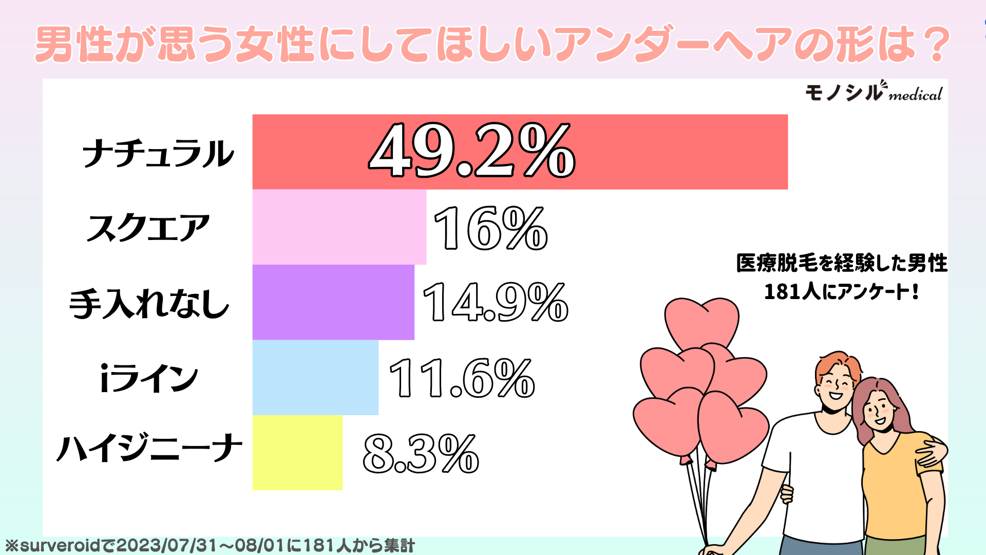 医療脱毛を経験したことがある男性181人から、女性にしてほしいと思うアンダーヘアの形に関するアンケート調査を行ったのに対して、「ナチュラル」が49.2%、「スクエア」が16%、「手入れなし」が14.9%、「iライン」が11.6%、「ハイジニーナ」が8.3%という結果になりました。