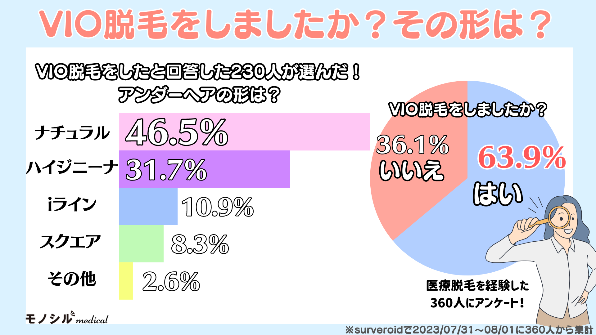 VIOの脱毛をしましたか?というアンケートに対し、63.9%(360人中230人)が行ったと回答しました。