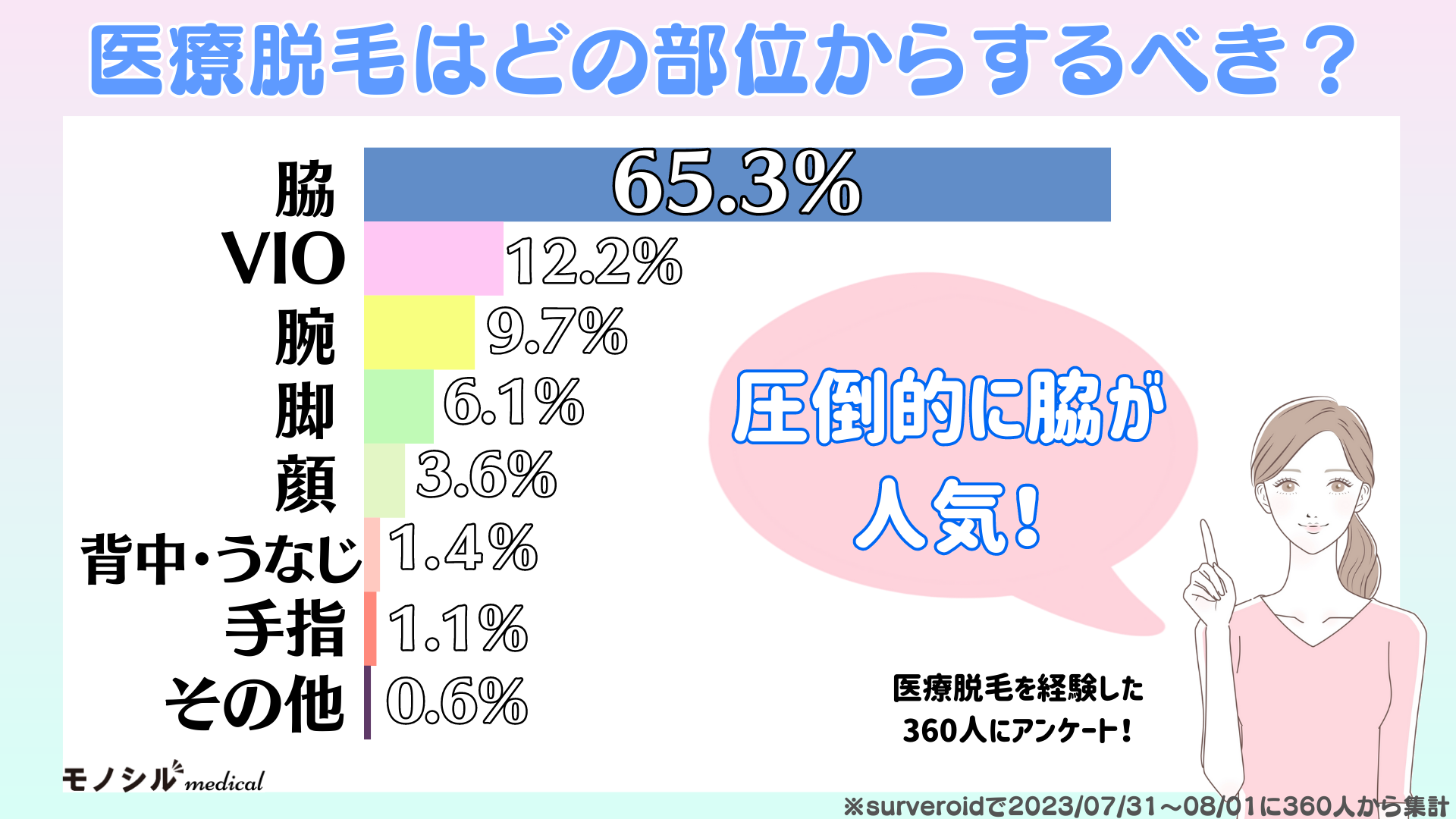 そんな方々の参考になればと思い行った「医療脱毛はどの部位からするべきか」というアンケート調査に対して、「脇」が65.3%、「VIO」が12.2%、「腕」が9.7%、「脚」が6.1%、「顔」が3.6%、「背中・うなじ」が1.4%、「手指」が1.1%、「その他」が0.6%という結果になりました。