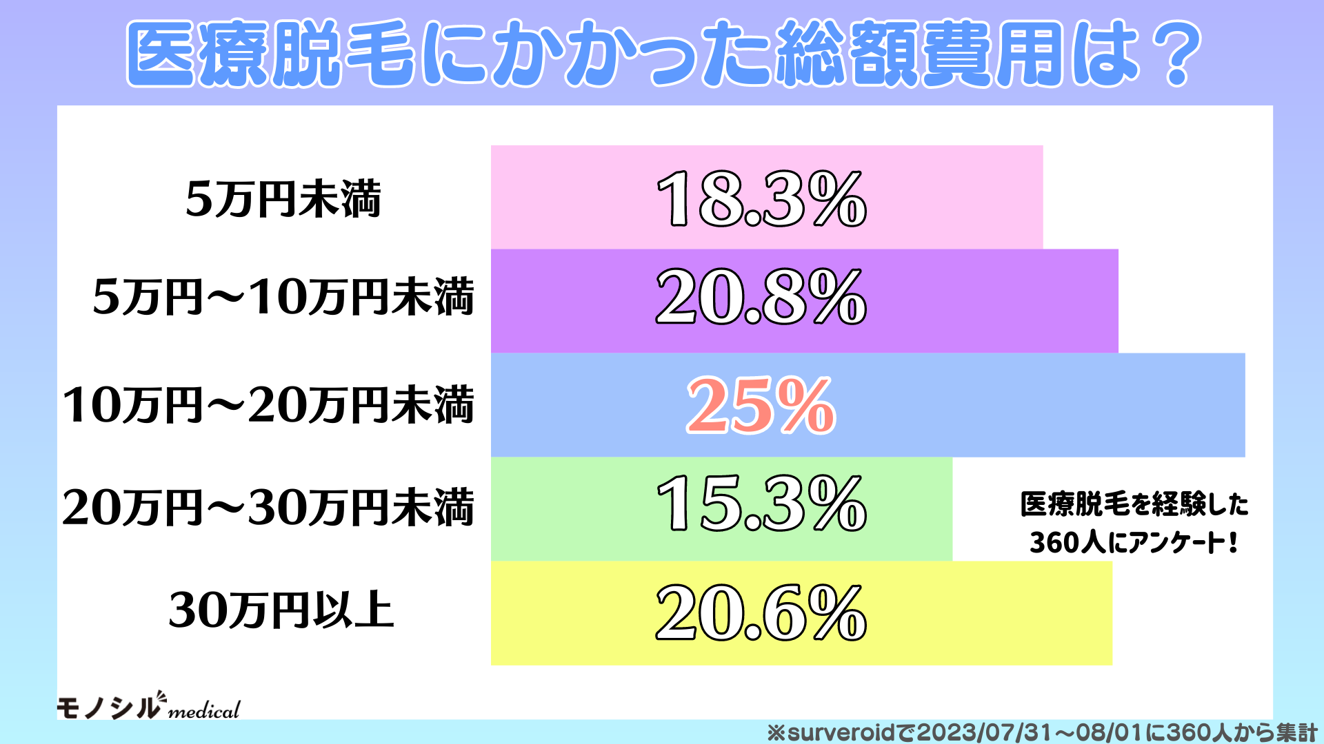 医療脱毛にかかった総額費用に関するアンケート調査に対して、「5万円未満」が18.3%、「5万円〜10万円未満」が20.8%、「10万円〜20万円未満」が25%、「20万円〜30万円未満」が15.3%、「30万円以上」が20.6%でした。