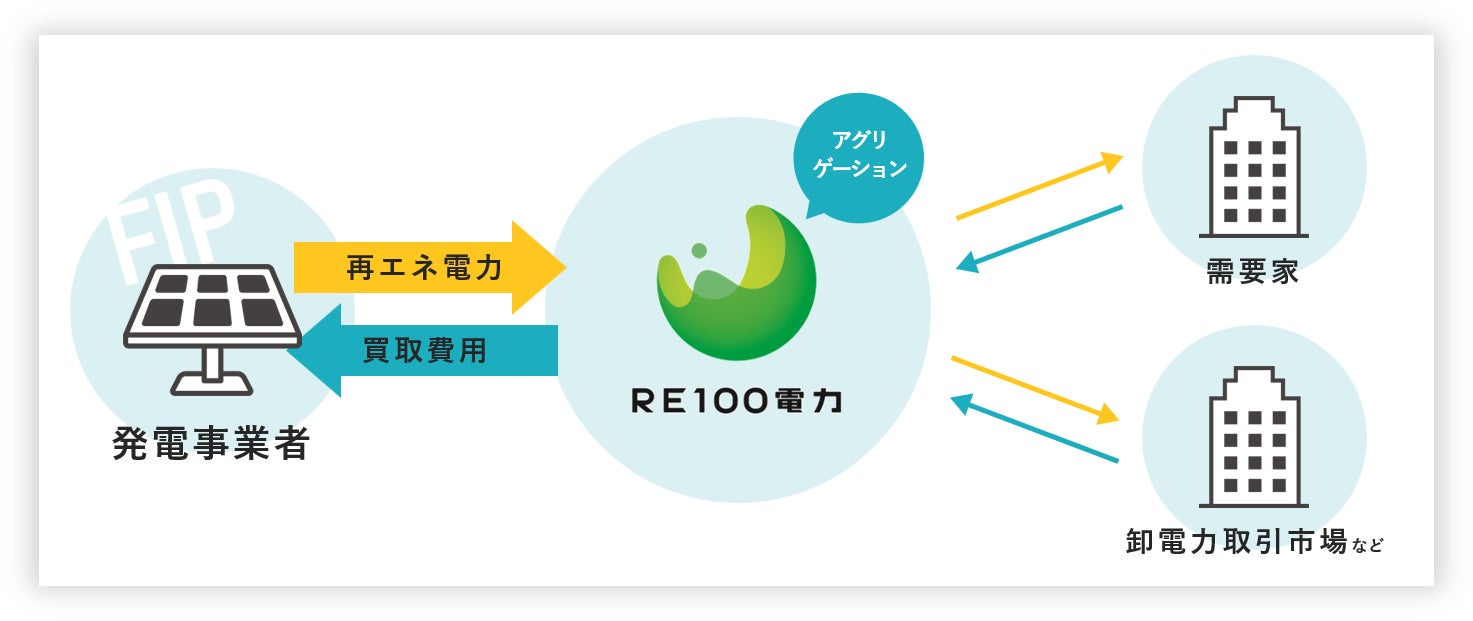 当サービスは、相対にてRE100電力が発電事業者と電力受給契約を締結のもと、FIP太陽光発電設備にて発電された電力を固定価格で買い取るものです。FIP申請に係る電力申請手続きやアグリゲーションはRE100電力が請け負うため、発電事業者のFIP導入負担が軽く、マーケットリスクの少ない従来の “ FIT発電所のような ” 個人投資家向けのサービスといえます。また、施工会社に対して太陽光発電設備や蓄電設備を割安な価格帯で販売することで、FIP施工提案の後押しを行います。そして本契約による電力は、再生可能エネルギーの利用を希望される需要家への供給や市場取引に活用されます。