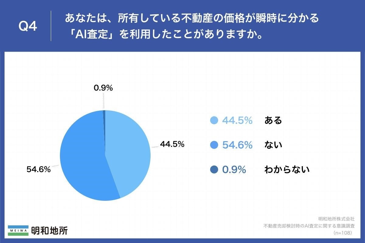 「Q4.あなたは、所有している不動産の価格が瞬時に分かる「AI査定」を利用したことがありますか。」(n=108)と質問したところ、「ある」が44.5%、「ない」が54.6%という回答となりました。