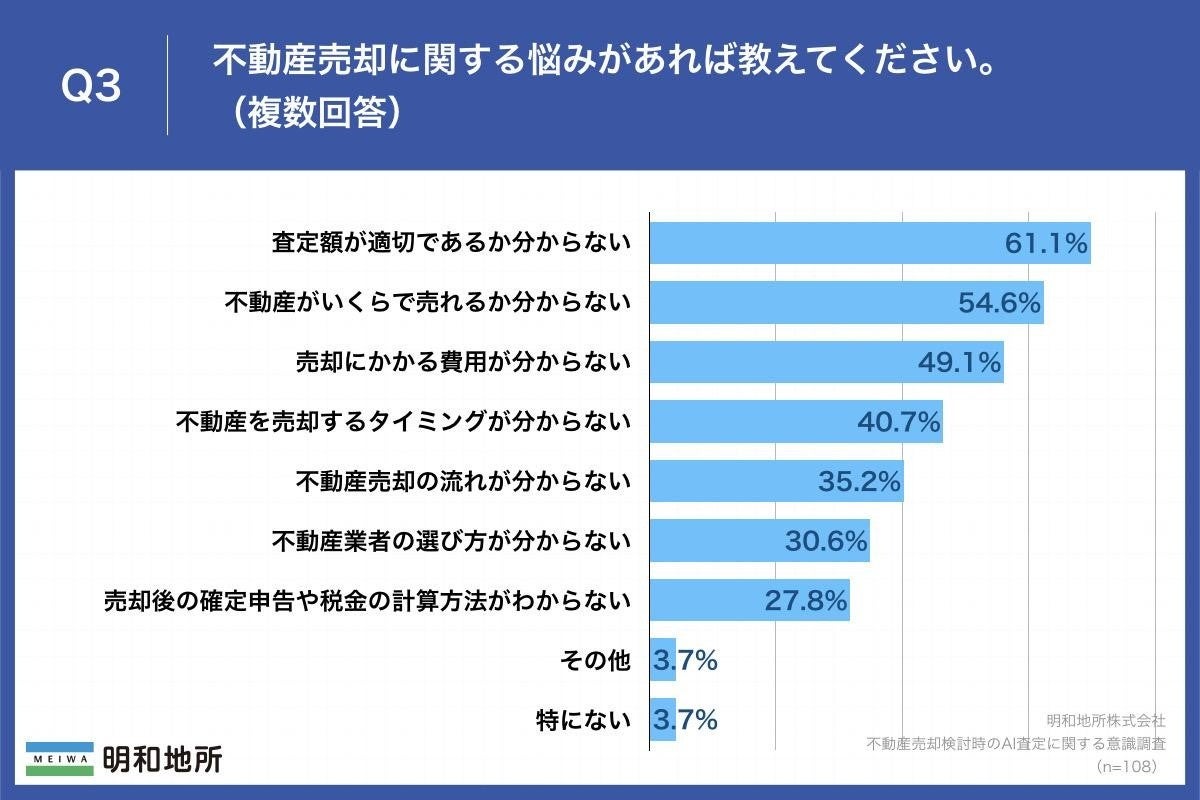 「Q3.不動産売却に関する悩みがあれば教えてください。(複数回答)」(n=108)と質問したところ、「査定額が適切であるか分からない」が61.1%、「不動産がいくらで売れるか分からない」が54.6%、「売却にかかる費用が分からない」が49.1%という回答となりました。