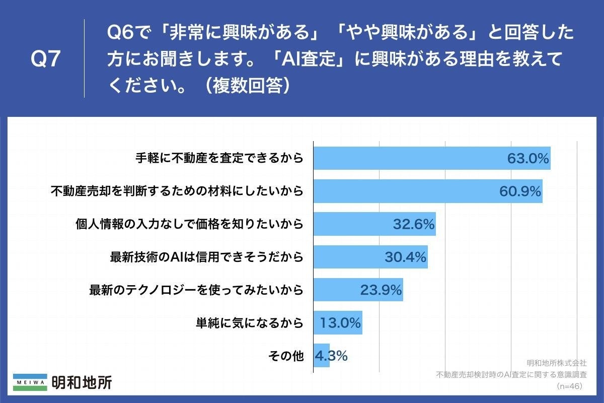 Q6で「非常に興味がある」「やや興味がある」と回答した方に、「Q7.「AI査定」に興味がある理由を教えてください。(複数回答)」(n=46)と質問したところ、「手軽に不動産を査定できるから」が63.0%、「不動産売却を判断するための材料にしたいから」が60.9%という回答となりました。