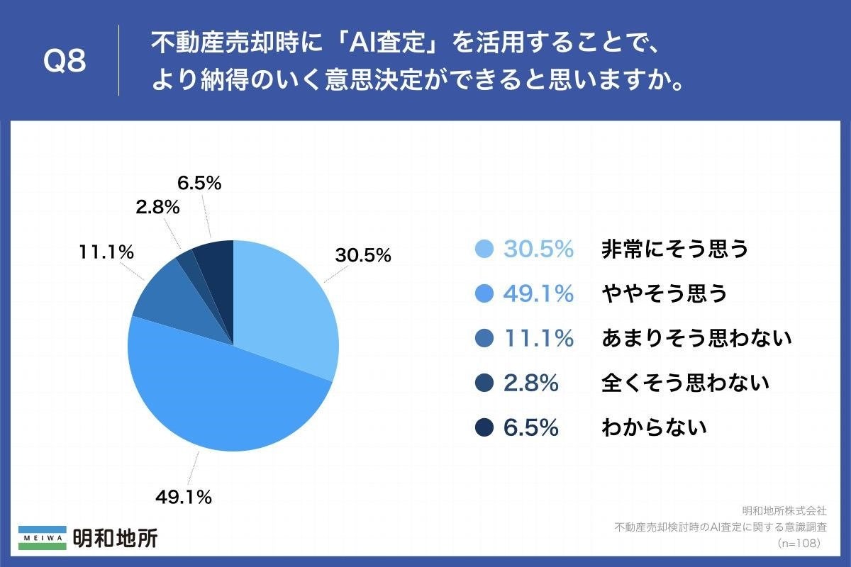 「Q8.不動産売却時に「AI査定」を活用することで、より納得のいく意思決定ができると思いますか。」(n=108)と質問したところ、「非常にそう思う」が30.5%、「ややそう思う」が49.1%という回答となりました。