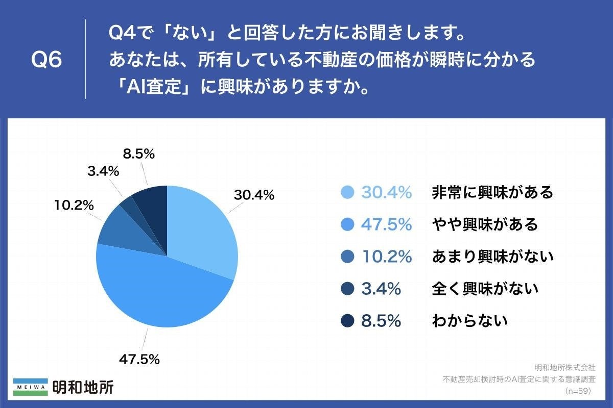 Q4で「ない」と回答した方に、「Q6.あなたは、所有している不動産の価格が瞬時に分かる「AI査定」に興味がありますか。」(n=59)と質問したところ、「非常に興味がある」が30.4%、「やや興味がある」が47.5%という回答となりました。
