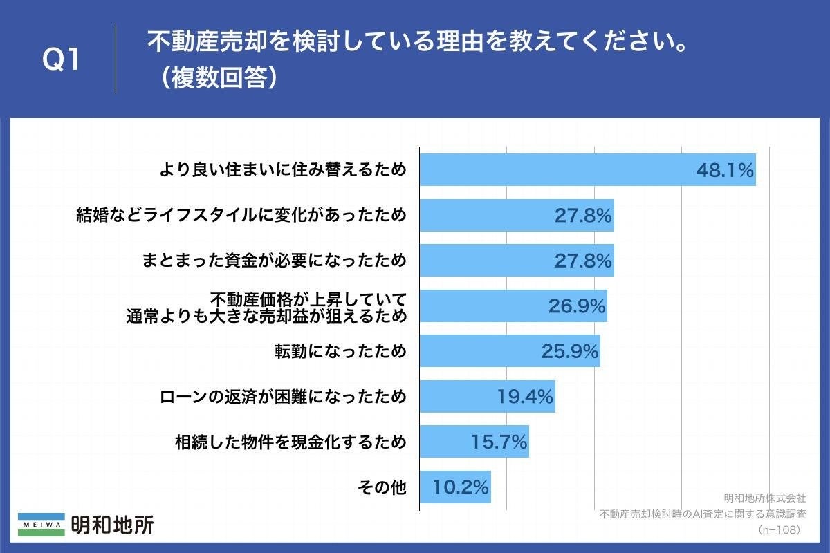 「Q1.不動産売却を検討している理由を教えてください。(複数回答)」(n=108)と質問したところ、「より良い住まいに住み替えるため」が48.1%、「結婚などライフスタイルに変化があったため」が27.8%、「まとまった資金が必要になったため」が27.8%という回答となりました。
