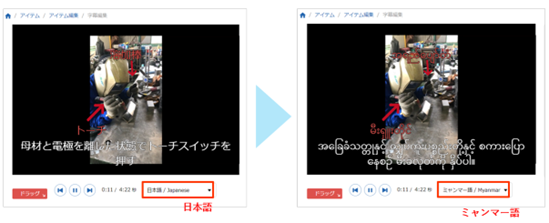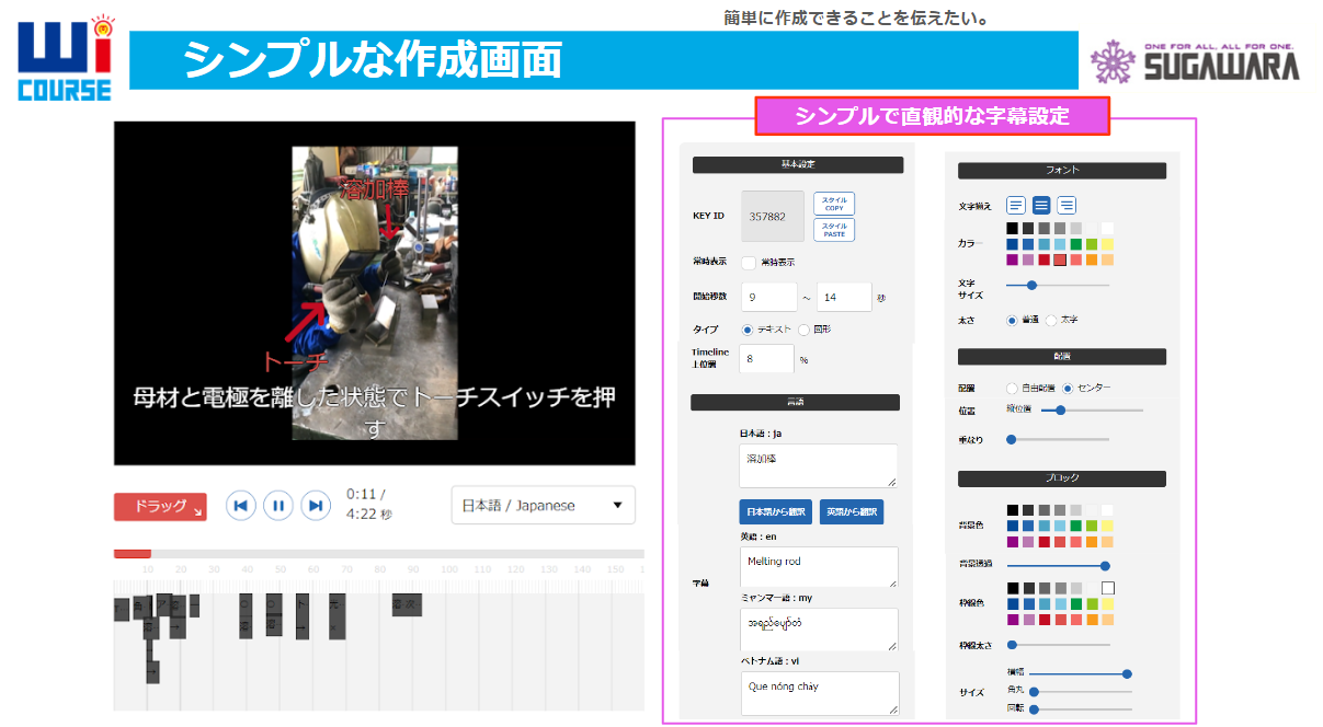 2.動画をWicourseへ取込み、字幕や図形を追加、多言語翻訳