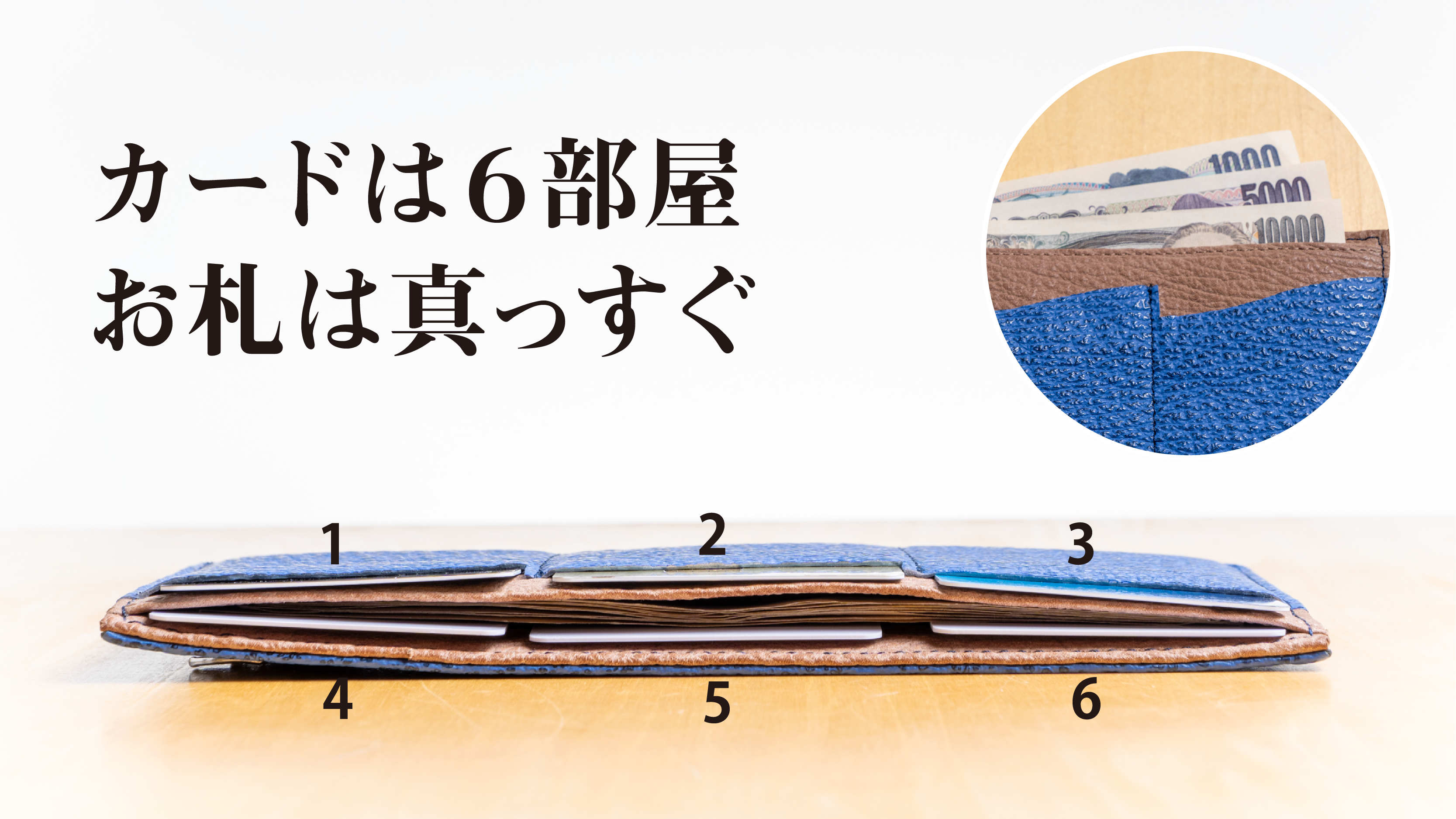 長財布として最薄級かつ最小級ながら、カード6枚を個別に収納でき、折らずに紙幣、小銭も