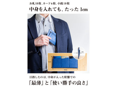 一般的に薄い財布とされる多くが何も“入れない”状態で厚み1.5~2cm前後なので、中身が”入った”状態で1cmは正に革命的です。