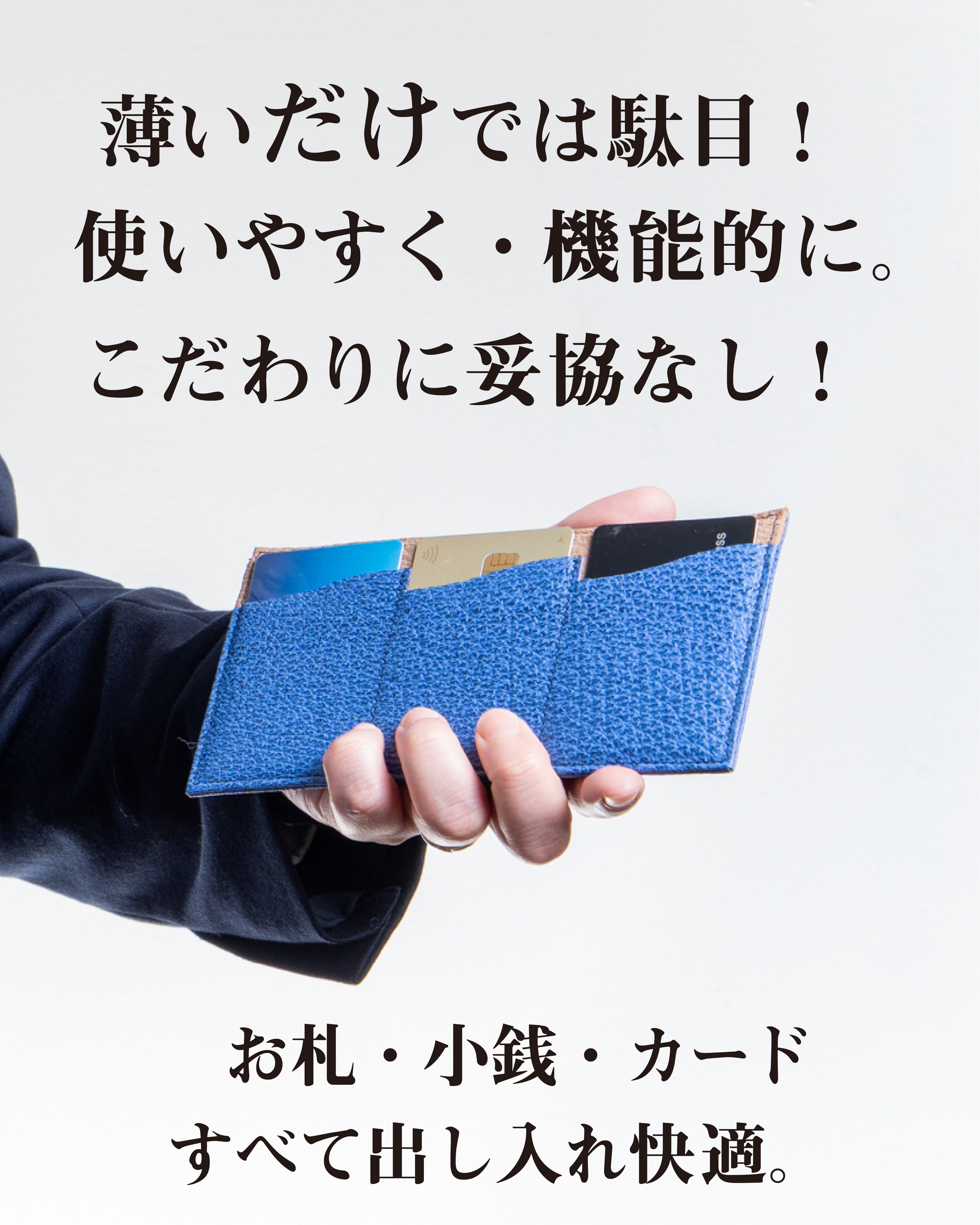 そこで私たちは、財布に日々入れておきたい最小数を【お札10枚・カード6枚・小銭10枚】と定め、それらを最も薄く嵩張らないように持ち運べる財布を設計しました。