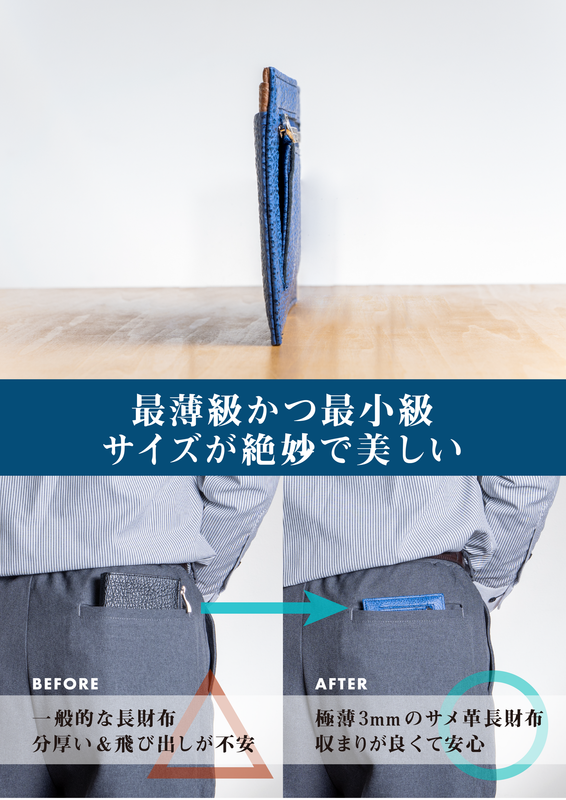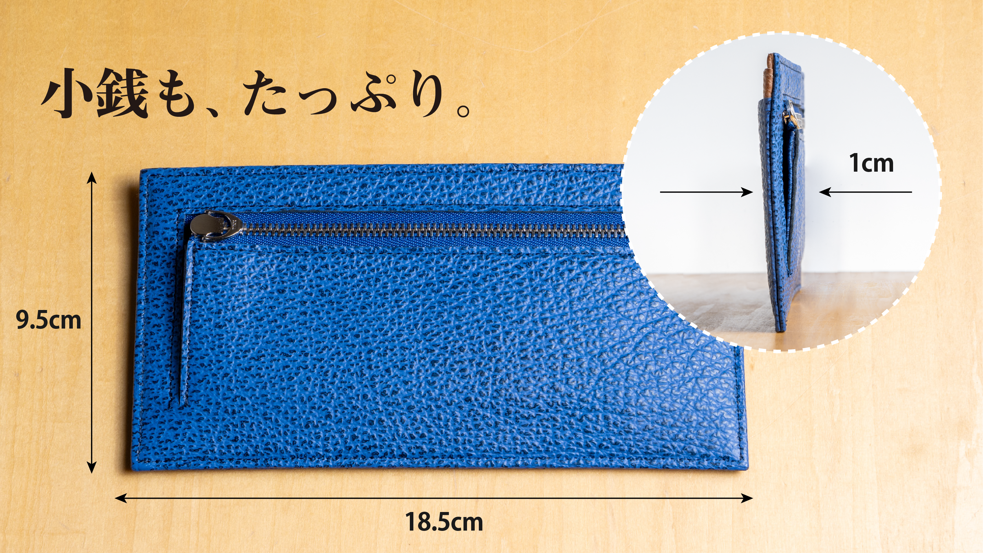 その結果、厚さ3mm、横幅は18.5cmの薄くて小さい長財布が完成しました。