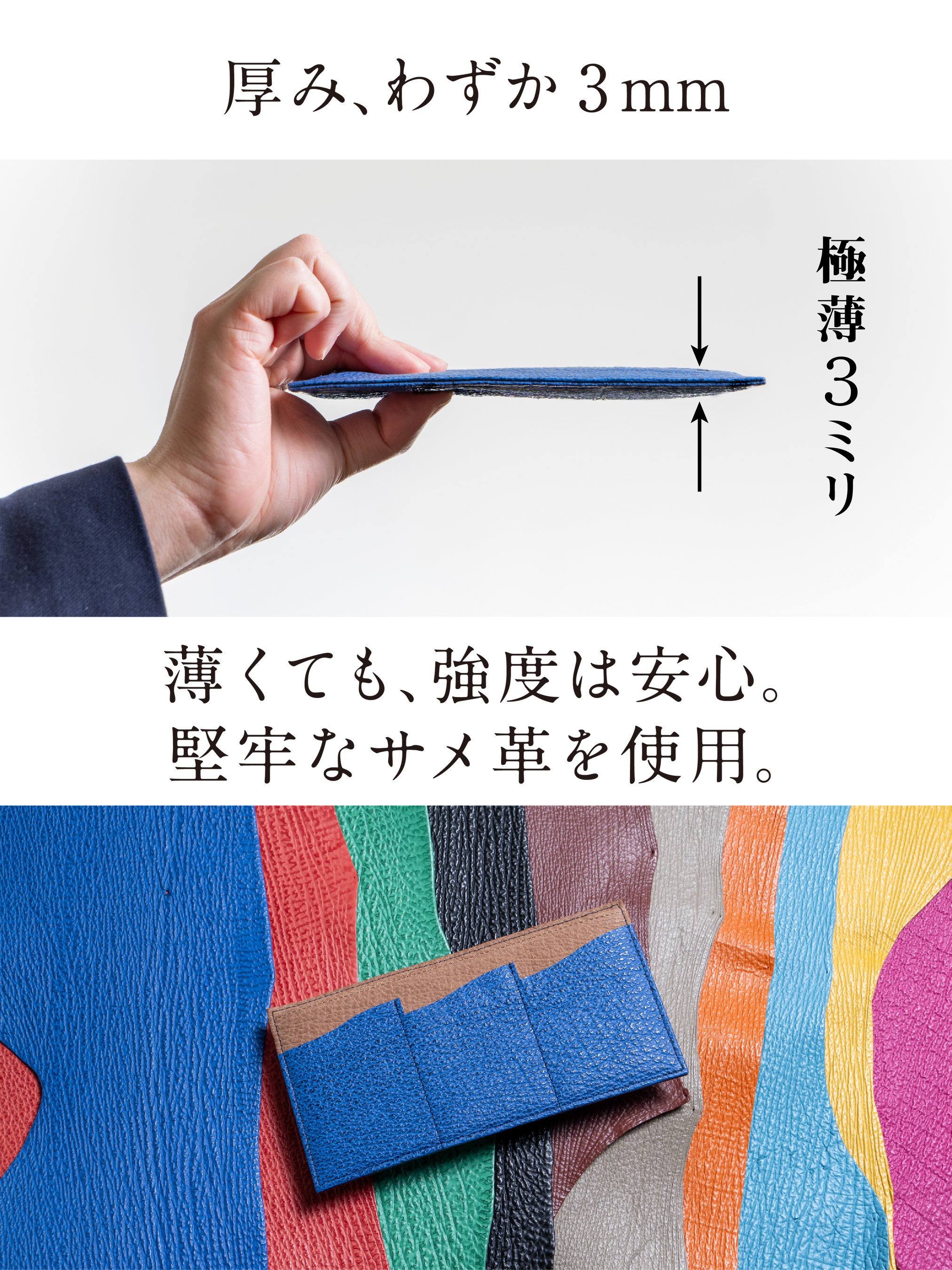 デザインは、宮城県気仙沼産サメ革の美しい発色と堅牢性を活かすことを追求しています。