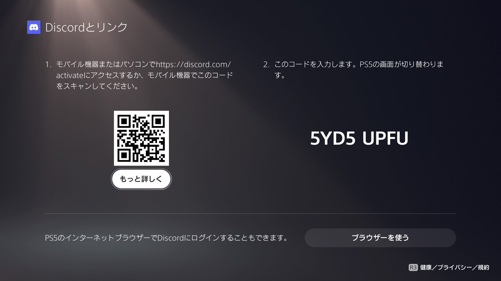 アカウントの連携を承認すると、連携の方法についての2つの選択肢が表示されます。QRコードを利用しスマートフォンのカメラアプリからサインインするか、あるいはPS5で「ブラウザを使用」を選択し、ゲーム機のインターネットブラウザからのサインインすることができます。どちらの方法でも連携可能ですが、QRコードの利用が非常に簡単でおすすめの連携方法となっています。