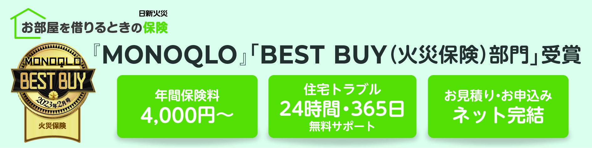 日新火災海上保険株式会社(社長:織山晋、以下「日新火災」)は、インターネット完結型の賃貸入居者向け火災保険「お部屋を借りるときの保険」が、株式会社晋遊舎が発行する月刊誌『MONOQLO』の2023年2月号(2022年12月19日発売)で「BEST BUY(火災保険)」に選ばれたことをお知らせします。