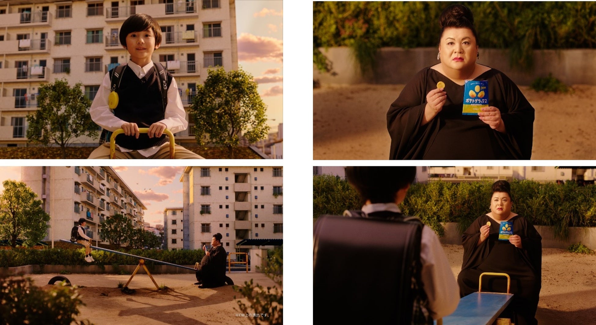 今回の新CMは、住宅街近くの公園でシーソーに乗るマツコ・デラックスさんと小学生が登場。「ポテトデラックスのデラックスって何ですか?」という小学生の問いかけに対し、マツコさんは「知りません・・!」と一言。最後にポテトデラックスを一口食べると、歓喜の表情を浮かべながらマツコさんなりの答えを発見したという内容になっています。コミカルでシュールなやりとりで終わり、気になるポテトデラックスの“デラックス”の内容がCM最後で明らかになります。CMを見ると思わず「ポテトデラックス」を食べたくなるような、美味しさを表現するマツコ・デラックスさんの表情にもご注目ください。