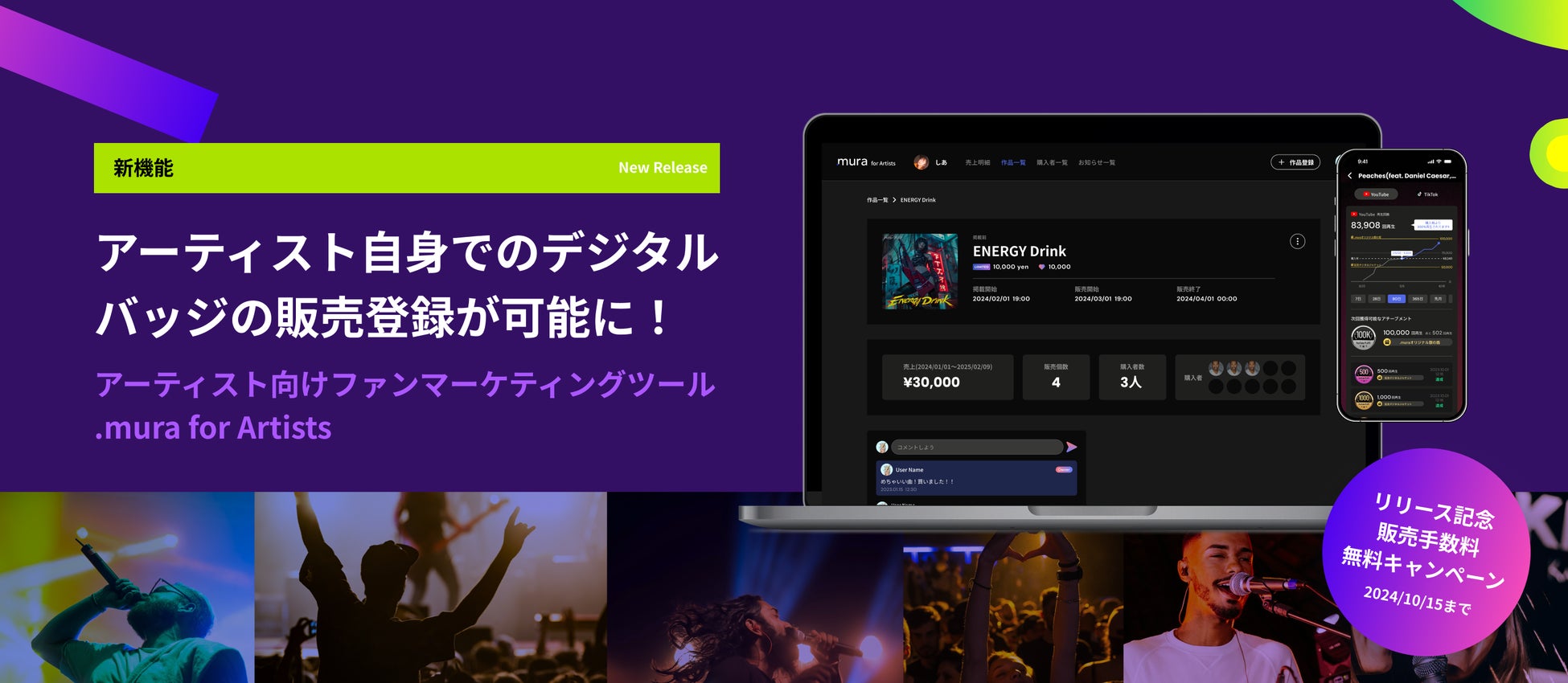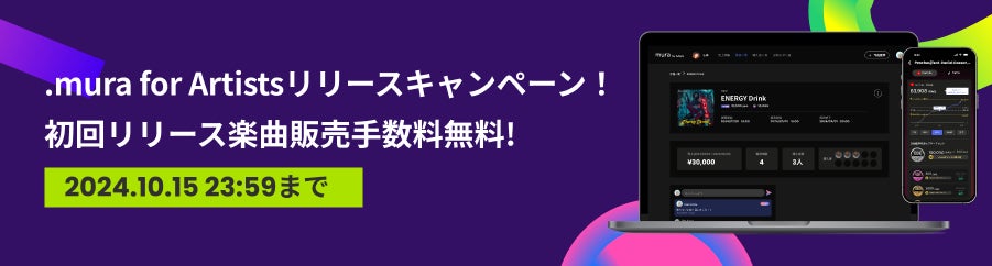 ドットミューラ株式会社(本社:東京都渋谷区、代表取締役:伴 幸祐)は、新曲のリリースをファンと共に盛り上げ熱狂を生み出すサービス「.mura(ドットミューラ)」のアーティスト向けページ「.mura for Artists」を9/5にリリースしました。アーティストやレーベルの皆様は、「.mura for Artists」を通して直接デジタルバッジ*1を販売することが可能になります。また、リリースを記念して、初回販売時の販売手数料が無料になるキャンペーンを実施します。