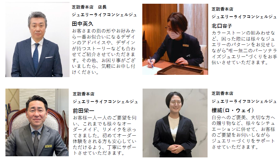 芝翫香は、「ジュエリーにまつわる“あらゆるお困りごと”にお応えしたい。」という信念を200年以上の歴史で変わらずに持ち続けています。お気に入りの一点に出会っていただくための品揃えとお取り寄せ、ジュエリーの美しさをいつまでも保ち続けるためのコンディショニング、さらには次世代へ引き継げるようなリメイク、世界に一つしかないオーダーメイドまで。芝翫香が提供しているのは、そんな様々な想いが詰まった、あなただけの“メモラブルジュエリー”。お客さまの宝石のある暮らしに常に寄り添いながら、人生が実り多いものになるようサポートするのが、ジュエリーライフコンシェルジュ 芝翫香の仕事です。会員入会特典もご用意しておりますので、芝翫香会員だけの特別なジュエリーライフを始めてみるのはいかがでしょうか。
