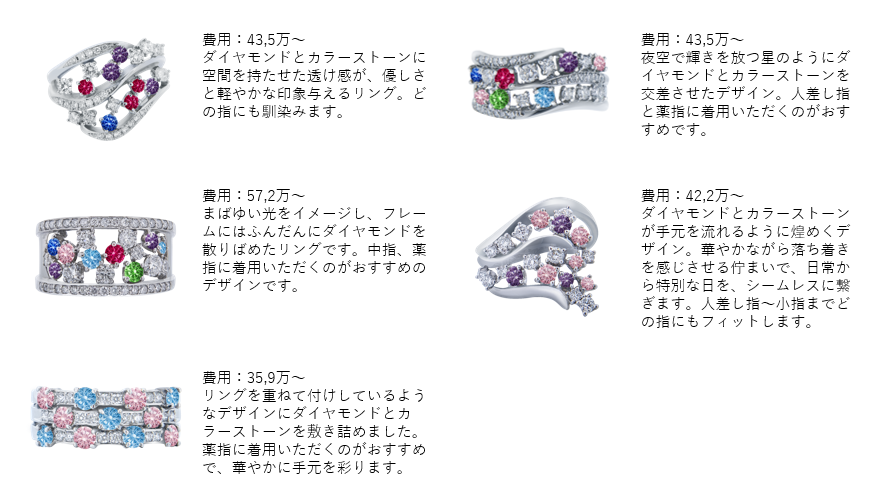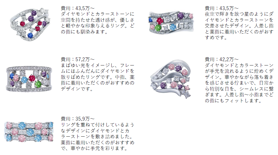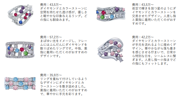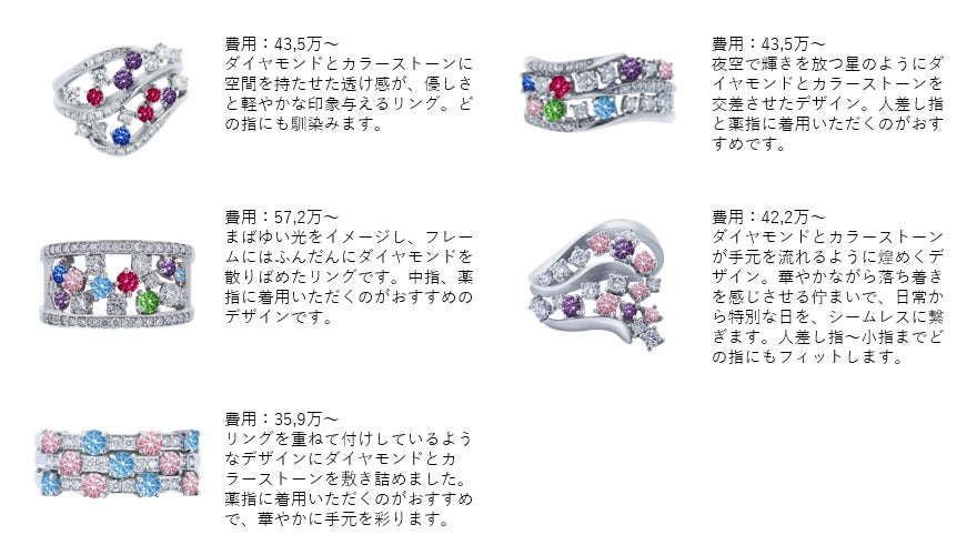 5種類のジュエリーフレームと6種類のカラーストーンが織りなすデザインは100万通り以上 ダイヤモンドもふんだんにあしらった「カスタムカラージュエリー」