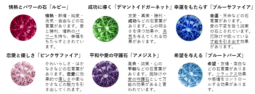 ダイヤモンドがたっぷりと散りばめられたフレームに、「ルビー」「デマントイドガーネット」「ブルーサファイア」「ピンクサファイア」「アメジスト」「ブルートパーズ」の全6種類から選べるカラーストーン