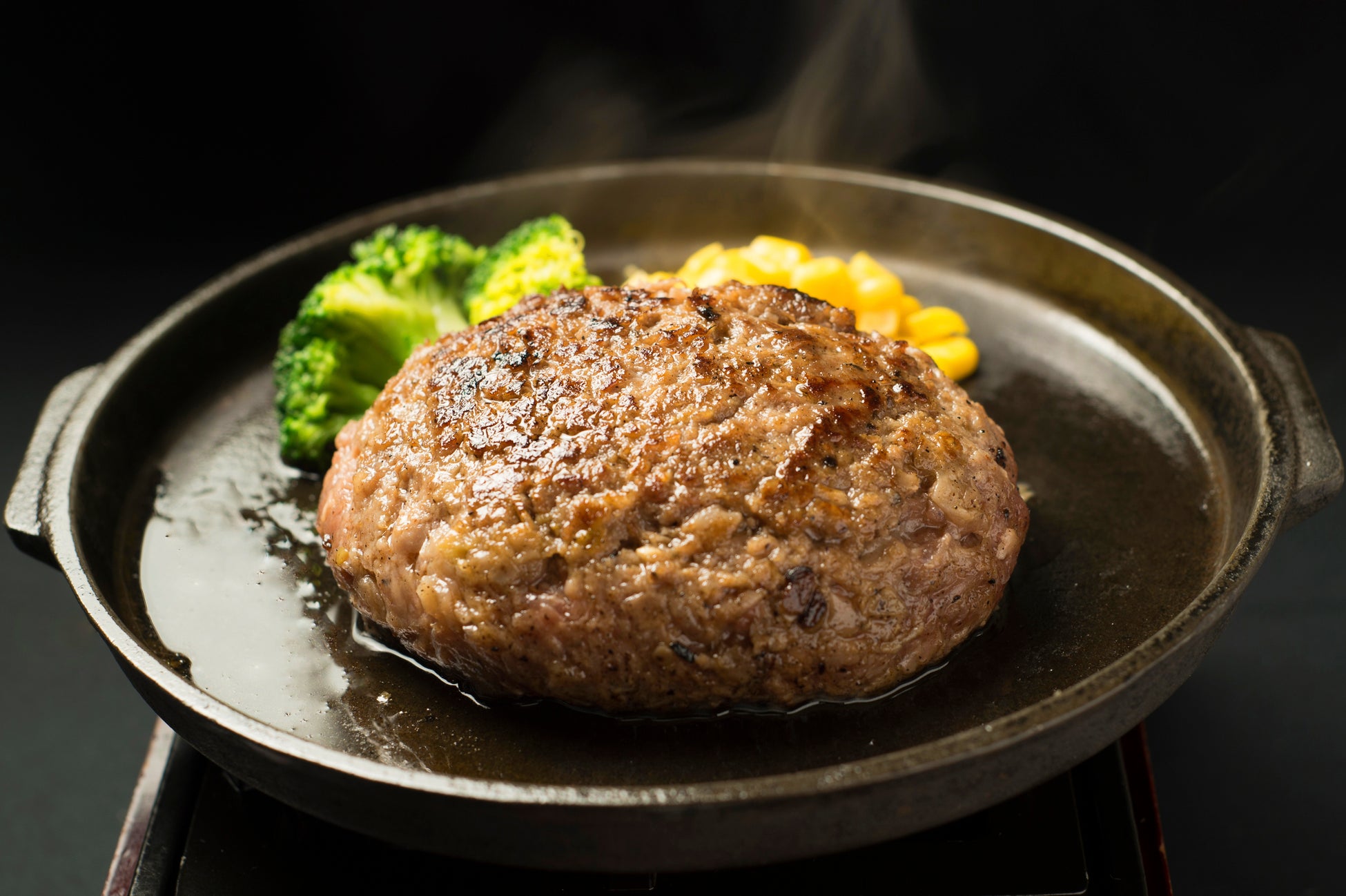 和牛を使用したハンバーグは、ステーキ用の上質な部位を贅沢にミンチにし、肉の繊維を感じるほどの粗挽き食感と、とろける柔らかさを両立。