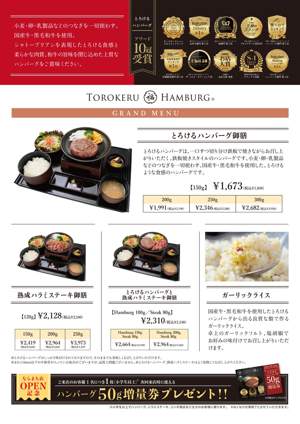 オープンを記念して、先着1,000名様に「ハンバーグ50g増量券」をプレゼント!
