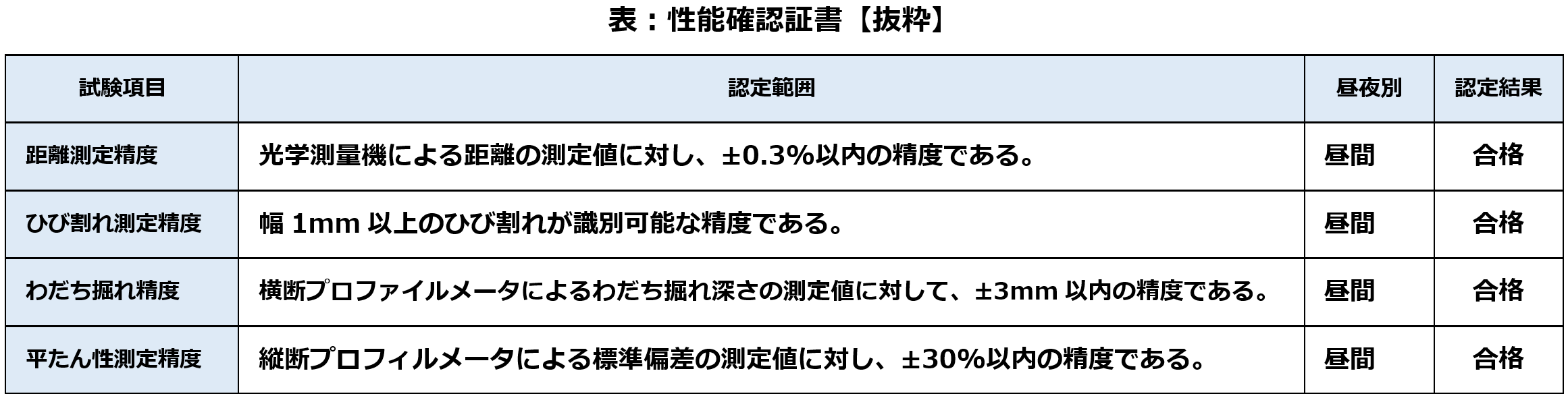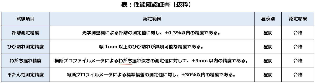 2022年:[路面性状自動測定装置の性能確認試験] の「平たん性」と「ひび割れ」に合格