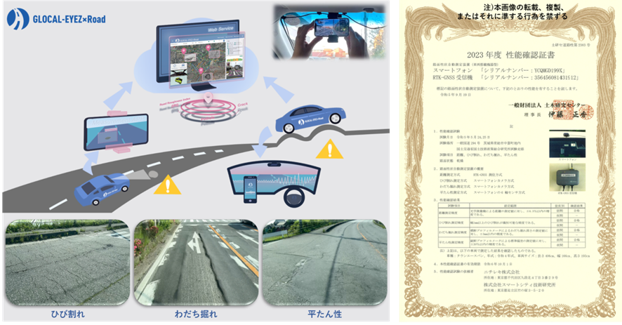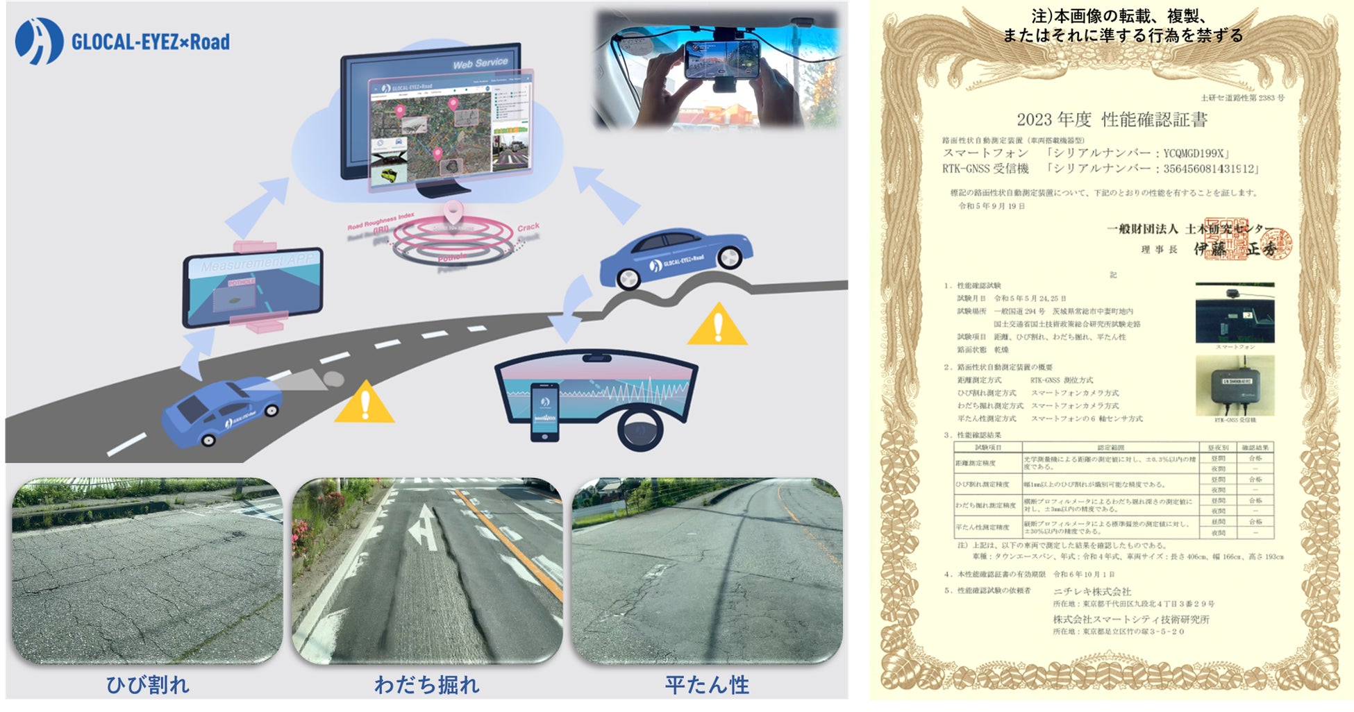 (株)スマートシティ技術研究所とニチレキ(株)が共同開発したスマートフォンによる道路点検DXシステム「GLOCAL-EYEZ」が、この度、一般財団法人土木研究センター実施の「2023年度路面性状自動測定装置の性能確認試験」(以下、性能確認試験)に合格しました。「GLOCAL-EYEZ」は、一般車両にスマートフォン1台を取り付け通常通りに走行するだけで、路面性状を測定できる技術です。このように専用の機器や車両を必要とせず、スマートフォンによる振動計測と画像撮影に基づくシステムとしては初めて、「ひび割れ」、「わだち掘れ」「平たん性」という路面点検の3要素のすべてに合格することができました。従来では、初期コストが1億円程度の専用の路面性状調査車により測定されていた路面性状点検の全指標を、1台の車両内設置スマートフォンで高精度に点検することができるようになり、道路点検業界の革命的な効率化、高度化への期待が寄せられています。