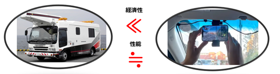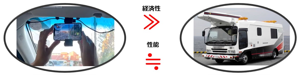 日本の道路の総延長は、120万kmにのぼると言われています。これら膨大な量の道路インフラは年々老朽化が進んでおり、国や自治体をはじめとする道路管理者は限られた予算の中で適切かつ効率的に維持管理していくことが求められています。現状の路面性状調査業務は、高価な路面性状調査車により行われており、その路面性状調査車は1台あたり1億円ともいわれる初期コストおよび、運用コストとデータ解析の手間が課題となっています。広大な道路ネットワークの状態を効率的かつ客観的に把握し、詳細調査や補修の要否、事故リスクの高い道路を確実に絞り込むスクリーニング技術が欠かせません。