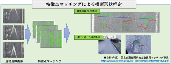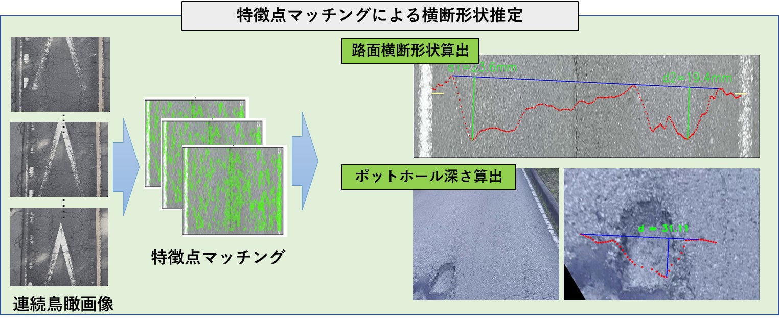 そこで、特徴点マッチングによる路面横断形状推定技術(特願:特願2023- 80856)を新たに開発し、車両内設置カメラによるわだち掘れへの定量評価に成功しました。この「わだち掘れ定量評価」の実現により、今回の性能確認試験において、全指標に同時合格することができました。なお、開発した特許技術は、わだち掘れのみならず、路面段差やポットホール深さの定量評価にも適用でき、現在多くの道路管理者に期待されています。