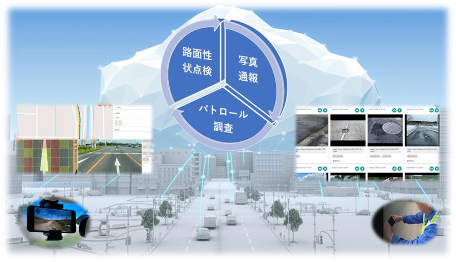 こうした背景を受けて、(株)スマートシティ技術研究所とニチレキ(株)は東京大学と共同で、スマートフォン1台だけで高精度に路面点検指標を測定できる手法を開発し、DXクラウドシステム「GLOCAL-EYEZ」に実装しました。簡易装置とクラウド技術の利点を生かし、道路維持管理業務のコスト削減、ならびに大幅な効率化が期待できます。
