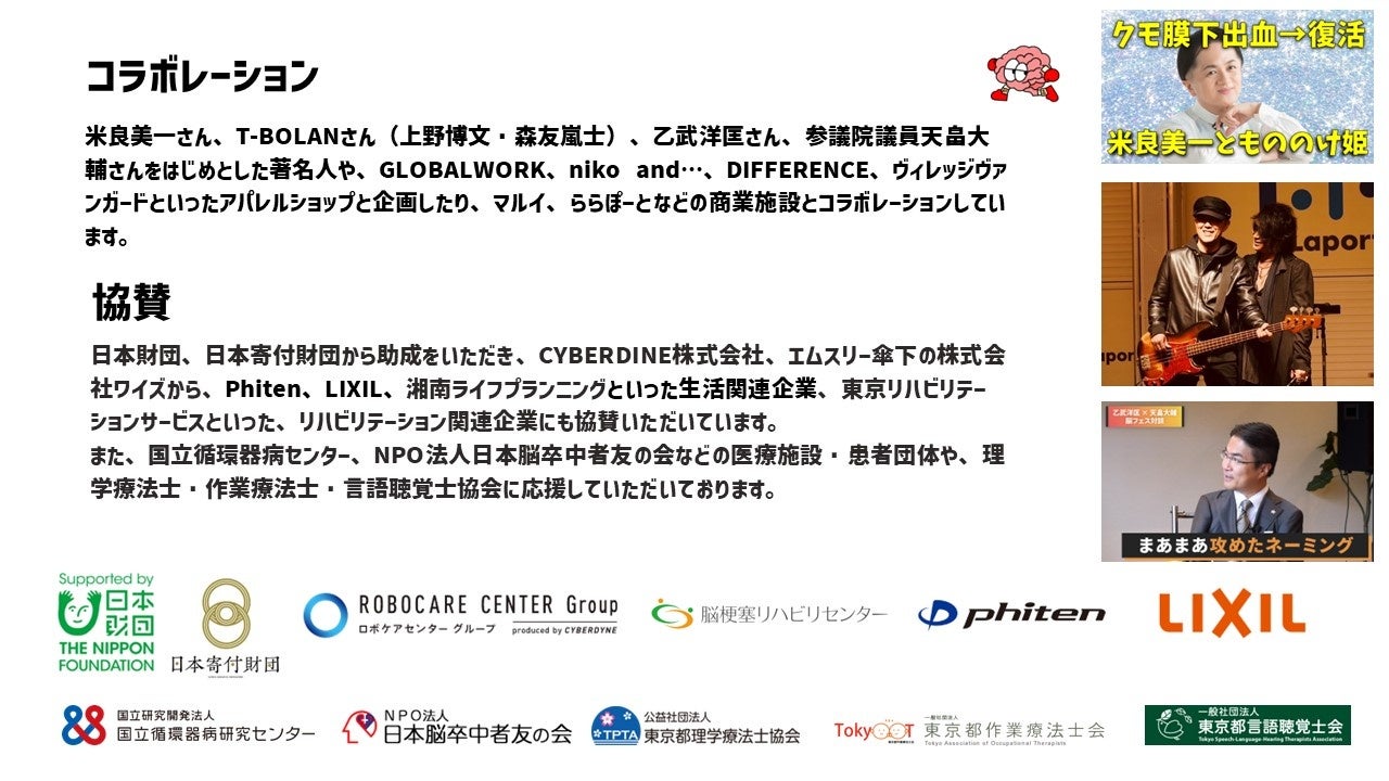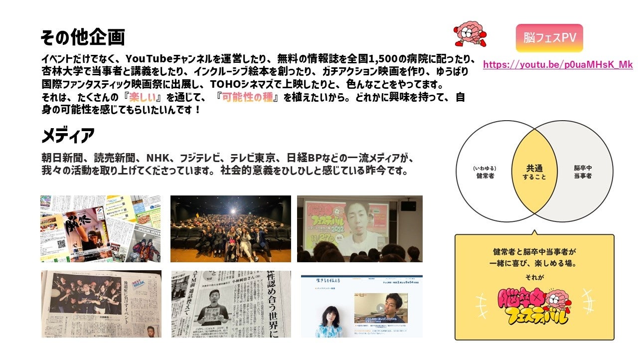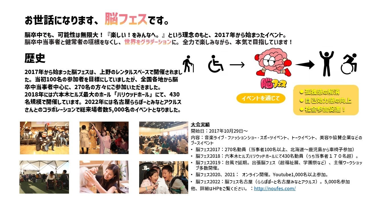 脳卒中フェスティバルは、非営利型一般社団法人脳フェス実行委員会が運営するイベントです。『楽しい!をみんなへ』の理念のもと、脳卒中当事者の社会参加や、一般世間への障がい者理解向上を促してきました。
