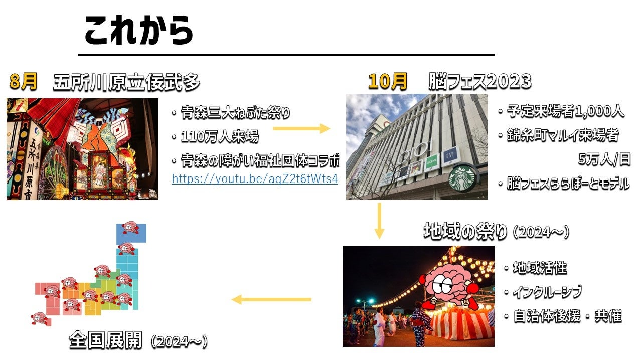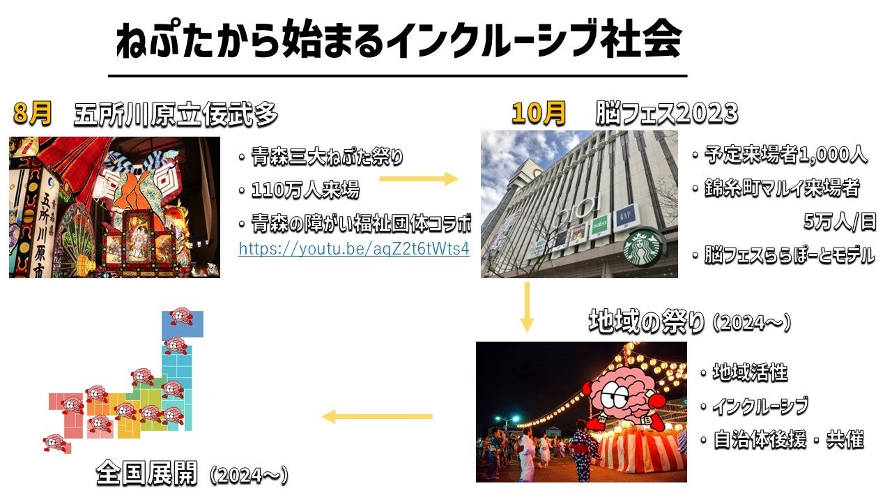 その山車を完成させ、 2023年8月4日のねぷた祭りに参戦 。同年10月29日に錦糸町マルイとコラボする脳卒中フェスティバルに展示し、来年以降も全国の地域の夏祭りに出展予定。祭りを通じてインクルーシブな社会にしていきます。