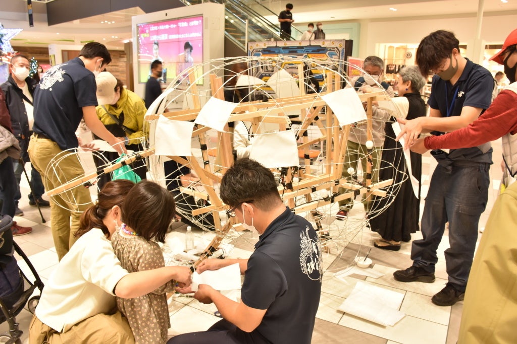 全国各地から障がい当事者が集い、来場者数5,000名のイベントとなりました。その会場で、日本を代表する大型の五所川原立佞武多製作者、成和會の福士裕朗さんの指導の下、障がい者・老若男女みんなで山車制作をしました。