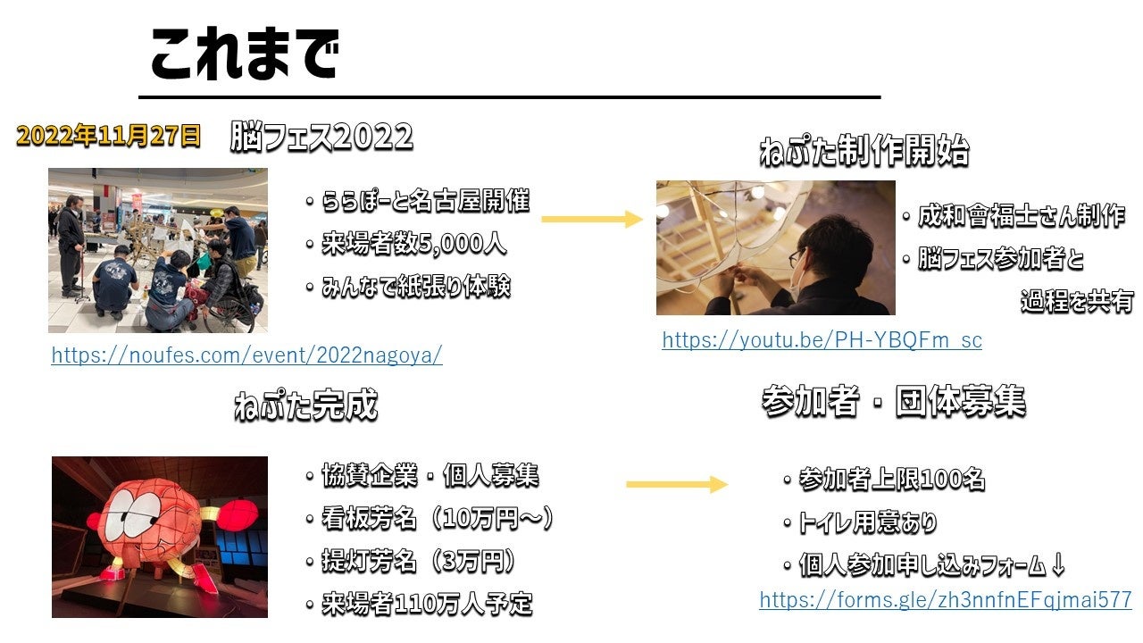 2023年8月4日に青森県五所川原で開催されるお祭りで、脳フェスねぷたは、障がい当事者と共に、約110万人の来場者の前を1.2km練り歩きます。非日常のワクワク体験から、当事者さんの社会参加のキッカケとしたいのです。