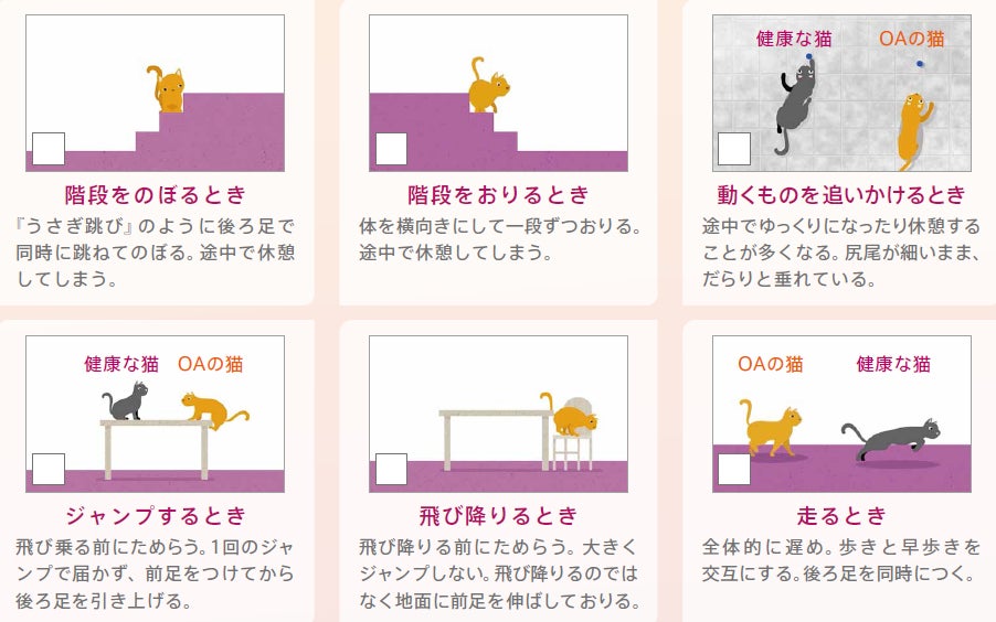キャットタワーに飛び乗りたいけど“動けない”、猫じゃらしで遊びたいけど“動けない”、階段を駆け下りたいけど“動けない”など、OAにみられるさまざまな行動について紹介しています。また動画後半では、日常の愛猫の様子を撮影した動画をもとに獣医師に相談する飼主の姿を描き、猫を飼うすべての方に参考していただきたい内容となっています。