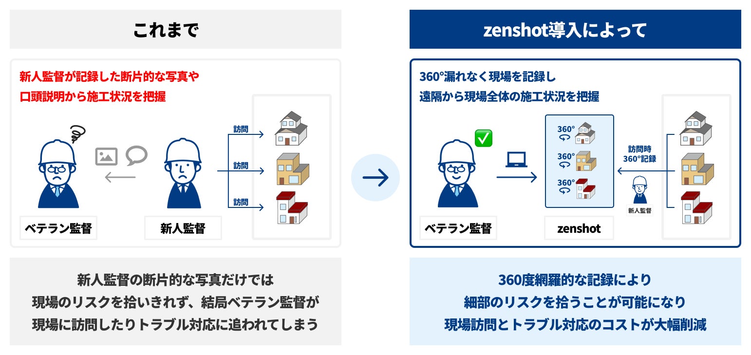 担当エリア内の交通渋滞の多さから、移動時間の多さには悩まされていました。zenshotを導入したことで、現場確認の内容によっては経験の浅いスタッフのみ現場に向かわせるということも可能になり、無駄な時間を省くことができるようになりました。zenshotでの記録は、単なる写真や動画による記録とは異なり、建物の外回りや内部の細かいところまで記録できるので、検査漏れや施工漏れといったリスクも防ぐことができています。