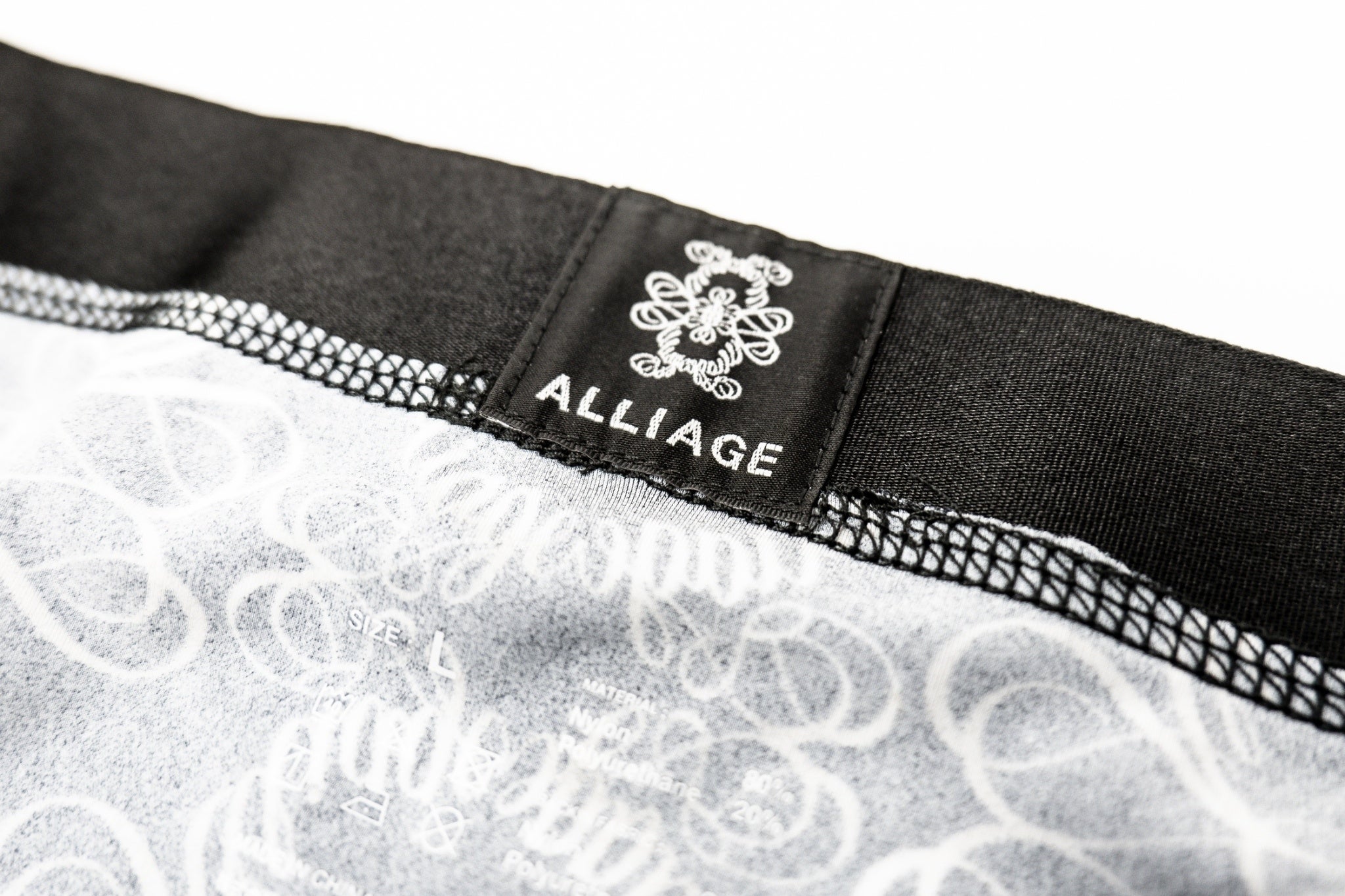そして、ウエストゴム後ろ側に配された「ALLIAGE」を象徴するエンブレムは、その繊細さから通常の織ネームでは表現することが叶わず、何度も試作を繰り返しながら超高密度織機にて完成された珠玉のピース。その美しい仕上がりはプロダクトに対するブランドのこだわりを示しているのです。