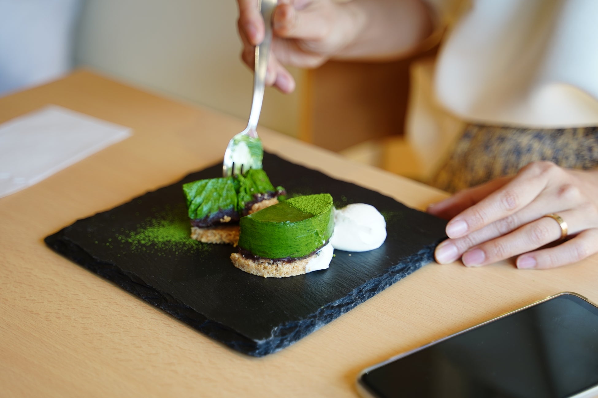 同店の最高級一番茶、「宝喜の極(ほうきのきわみ)もセットで付いているので、茶漉しなどで振りかけて華やかに飾るのもおすすめです。またフルーツ×抹茶もおすすめ。程よい酸味がお濃茶の味を引き立てます。