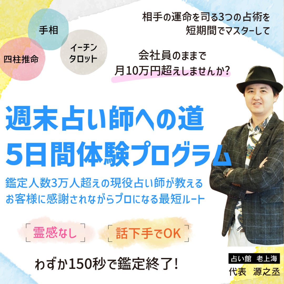 週末占い師への道5日間体験プログラムは、横浜中華街の占い館「老上海」の代表・源之丞が講師を務める、占い師になるための方法を教えるプログラムです。