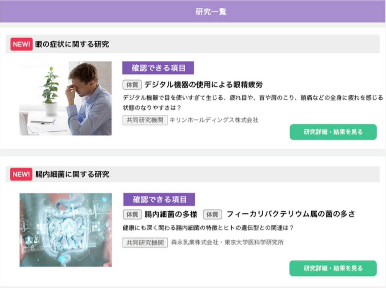 また、遺伝子検査結果の返却に併せて共同研究先が行った他の研究の情報や商品紹介も行います。