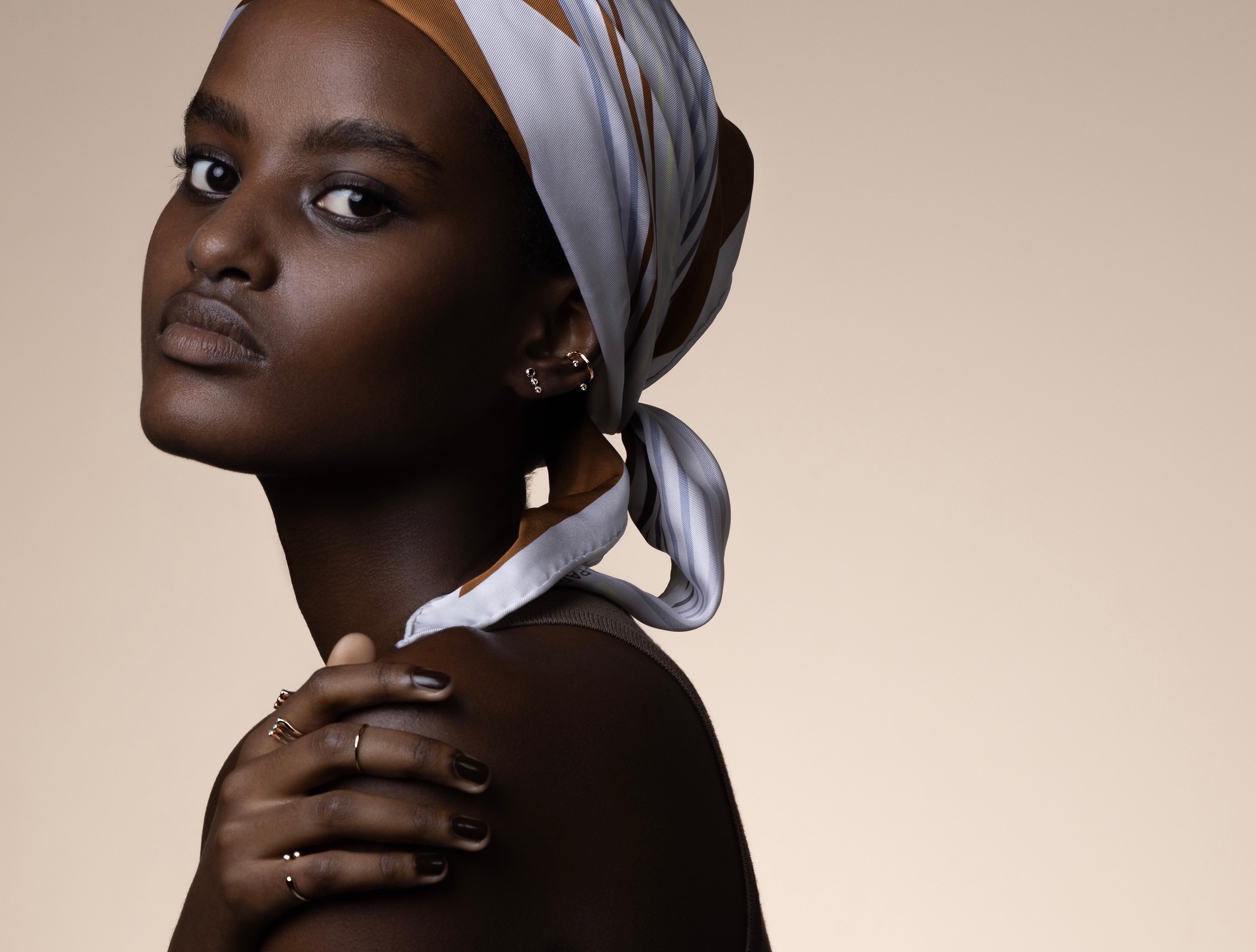 モデル着用: 「Drosera」 ブラック&ホワイトダイヤモンド スタッド ピアス ¥56,100「Drosera」 ダイヤモンド イヤーカフ ¥73,700