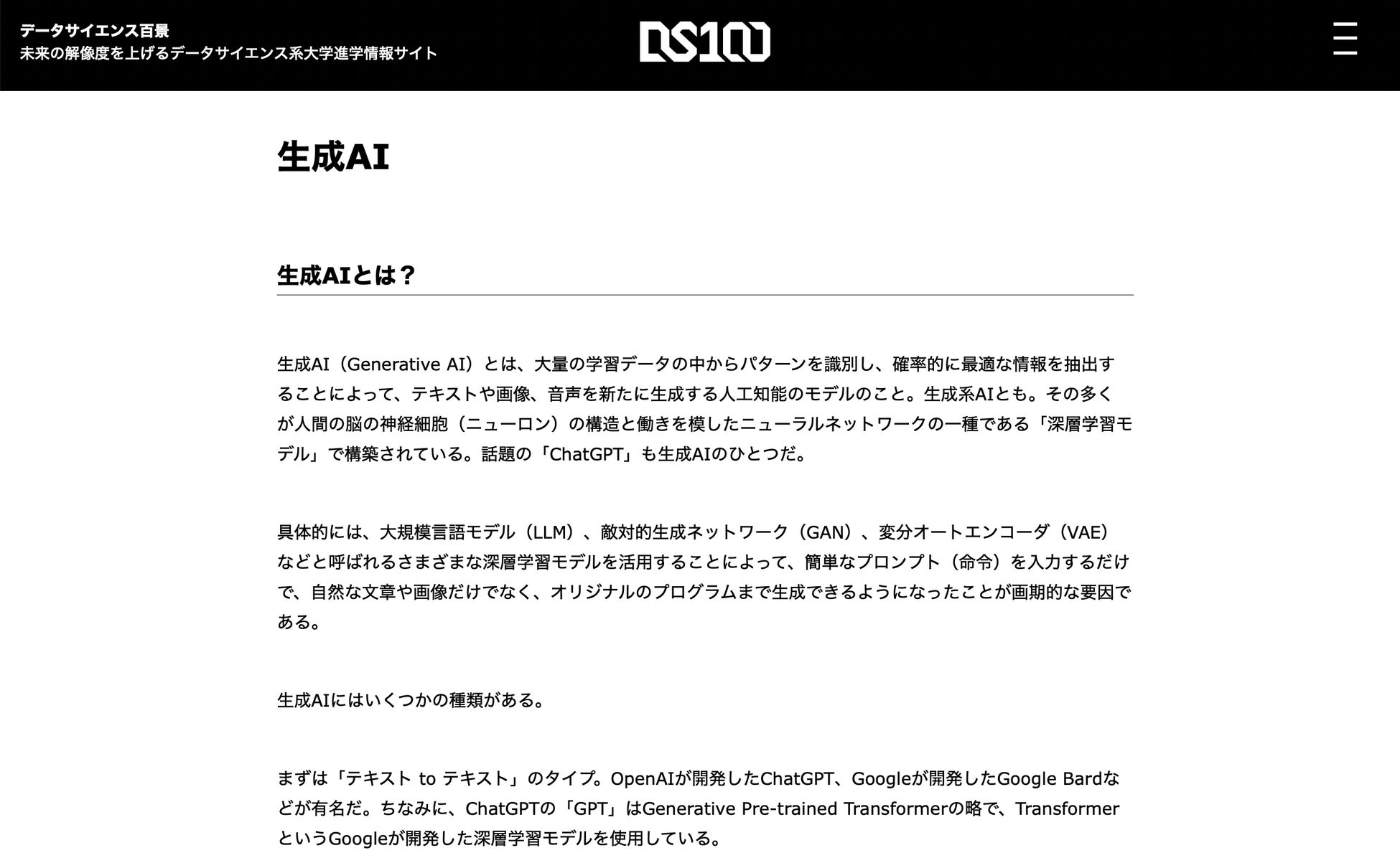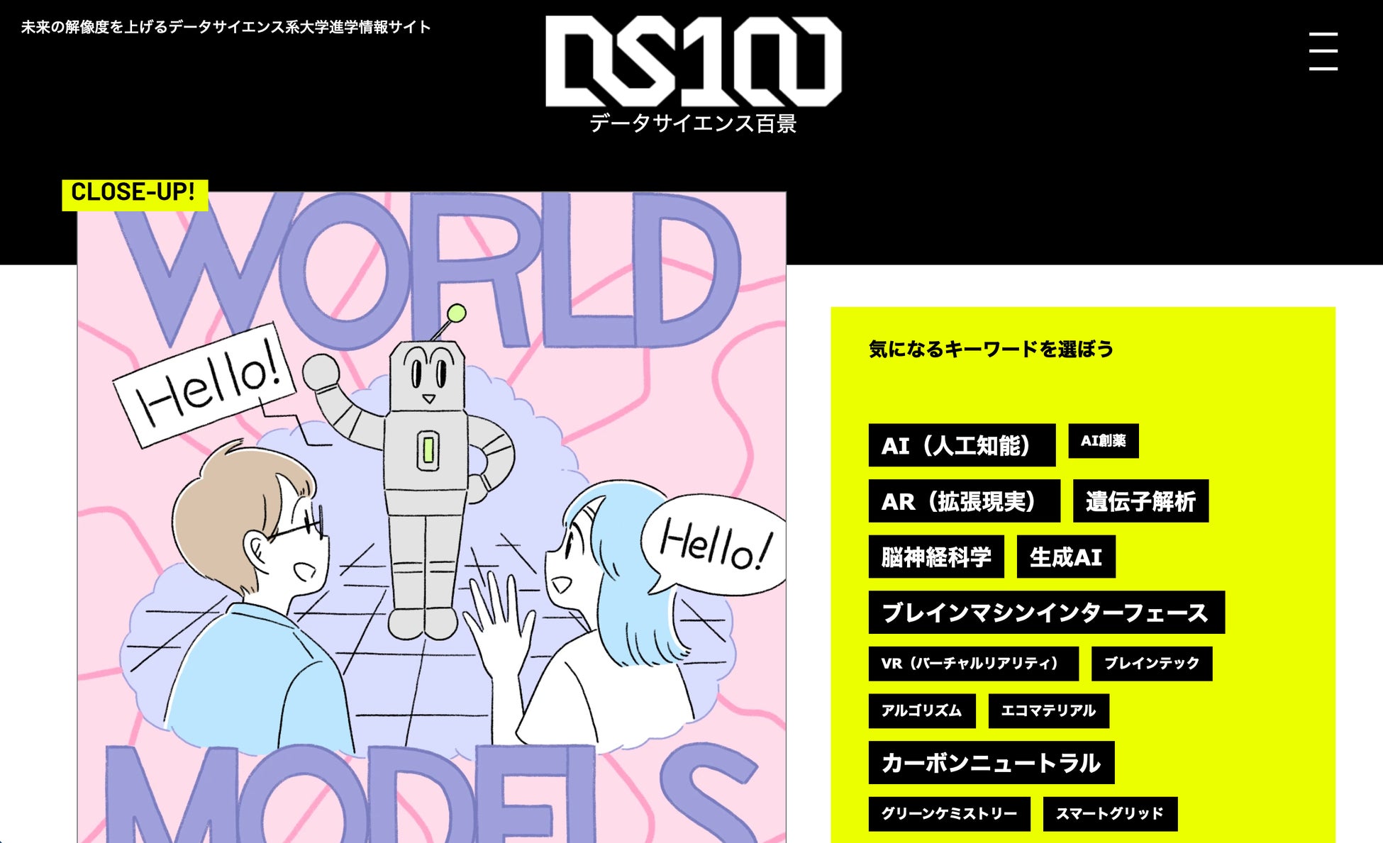 「データサイエンス百景」は、⽇本の⼤学が取り組むAI・データサイエンス系の教育・研究を紹介する進学情報サイトです。難しく思われがちなAI・データサイエンス分野の内容をわかりやすく伝えます!