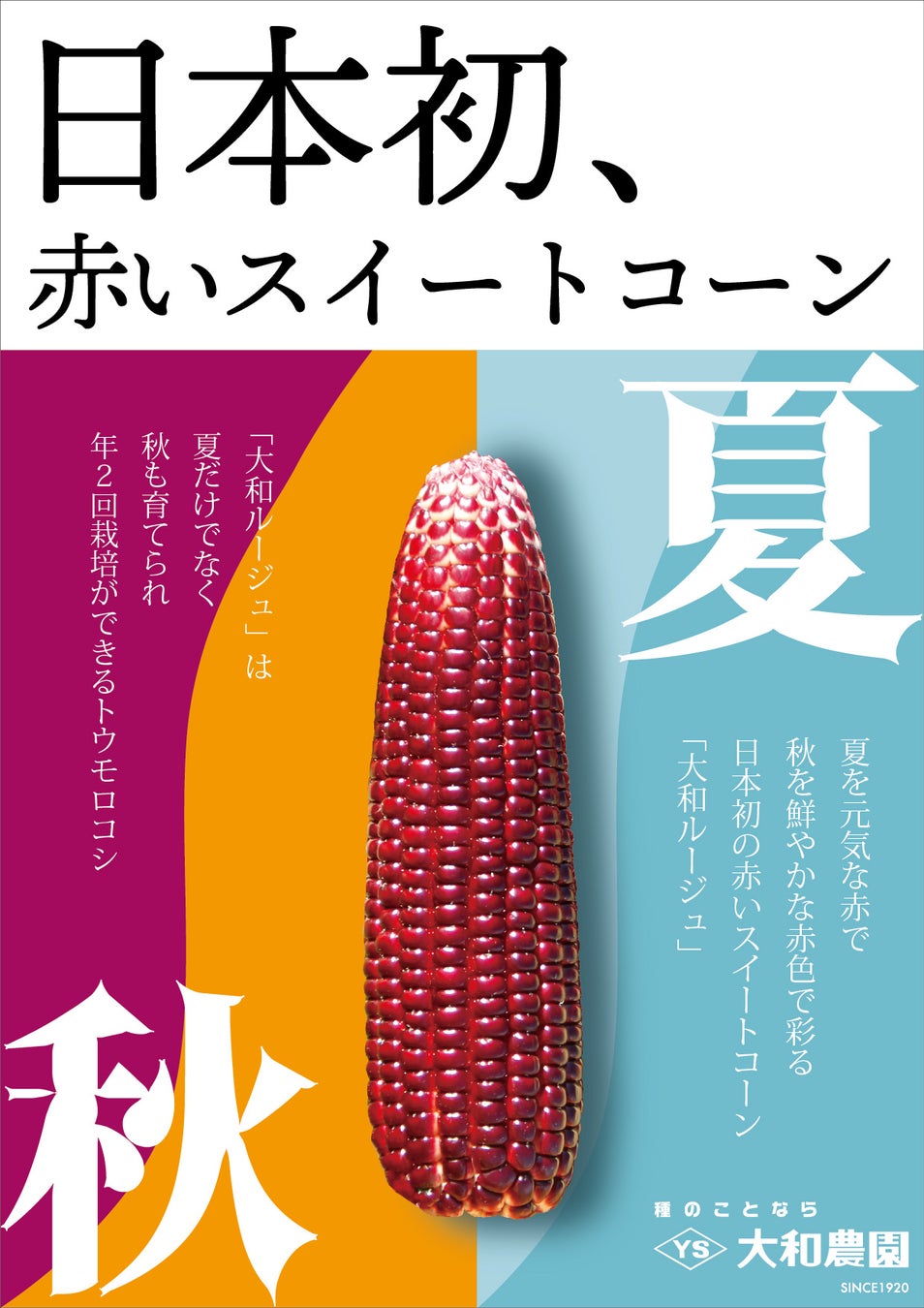 日本初*となる「赤色」のスイートコーンで、奈良で創業100年以上、野菜の ” タネ ” の研究開発を行う「種苗メーカー」の株式会社大和農園(本社:奈良県天理市、代表取締役社長:吉田 睦)が開発し、2022年10月中旬より全国で種子の販売を開始しました。