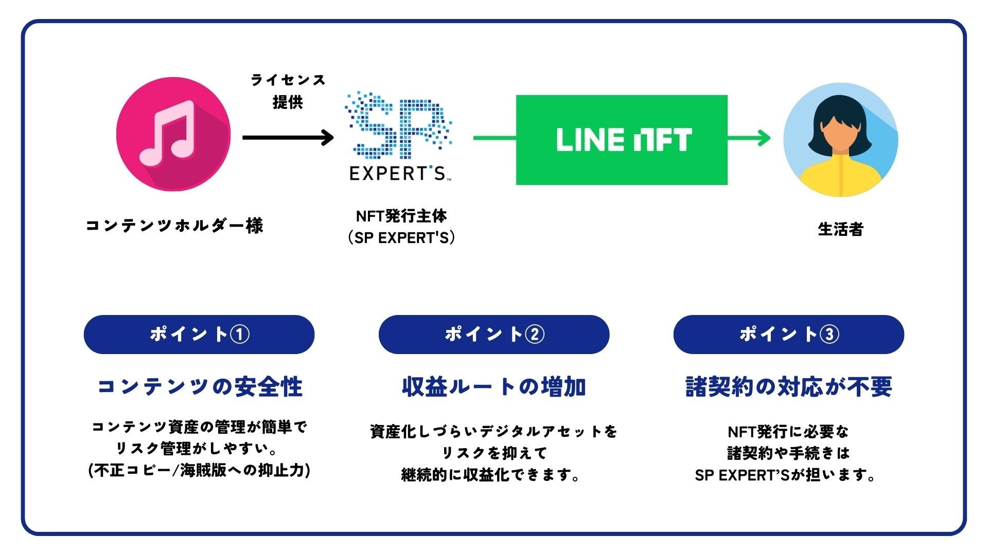 LINEでNFTを発行する場合、SP EXPERT’SがNFTの発行主体になるため、コンテンツホルダー様はライセンス提供をするだけでNFTの発行およびLINE NFTでの販売が可能となり、手軽にNFTへ参画することができます。