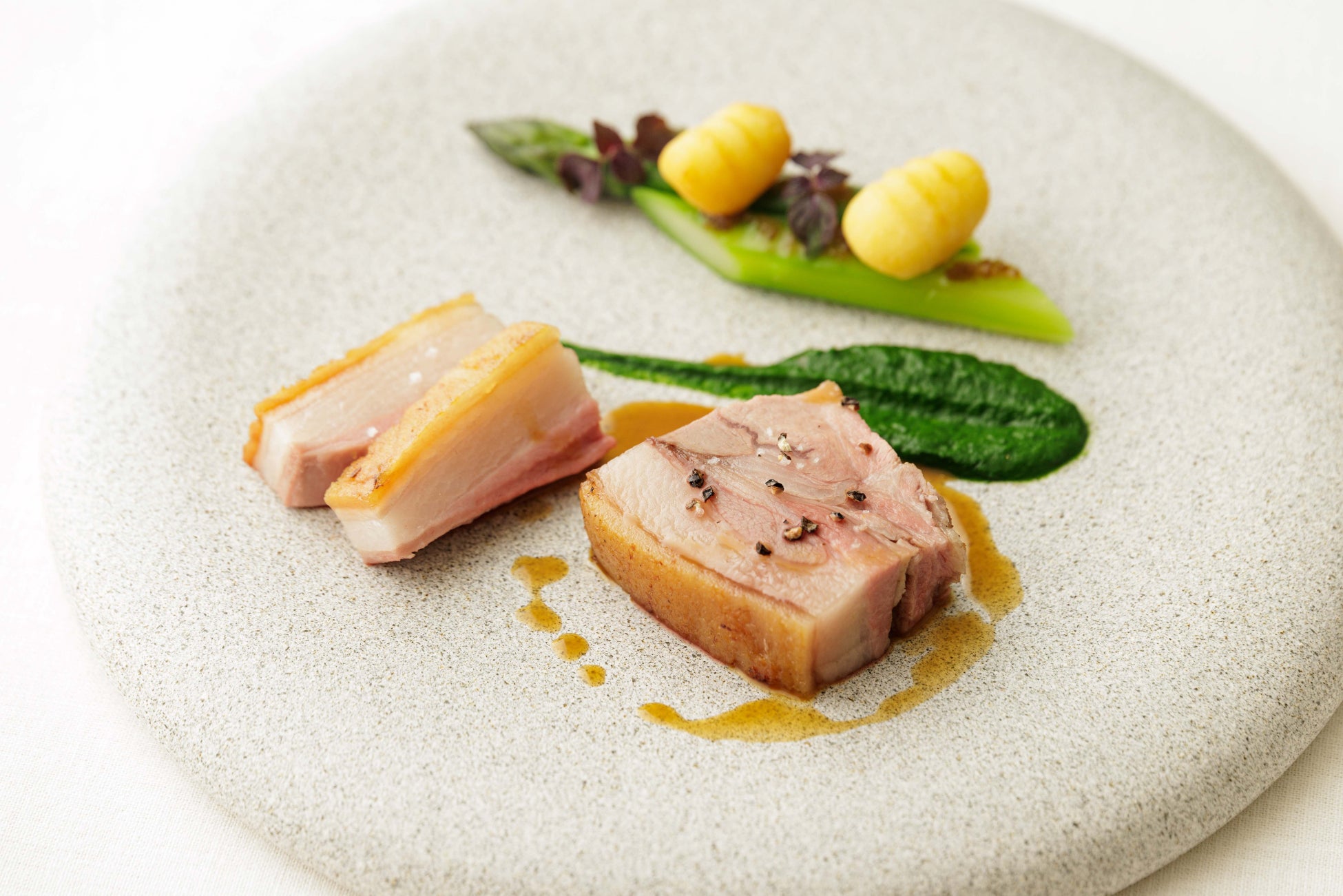 尾道産 春猪(うまず)とグリーンアスパラガスのロティ 揚げニョッキとニラソース 3,900円