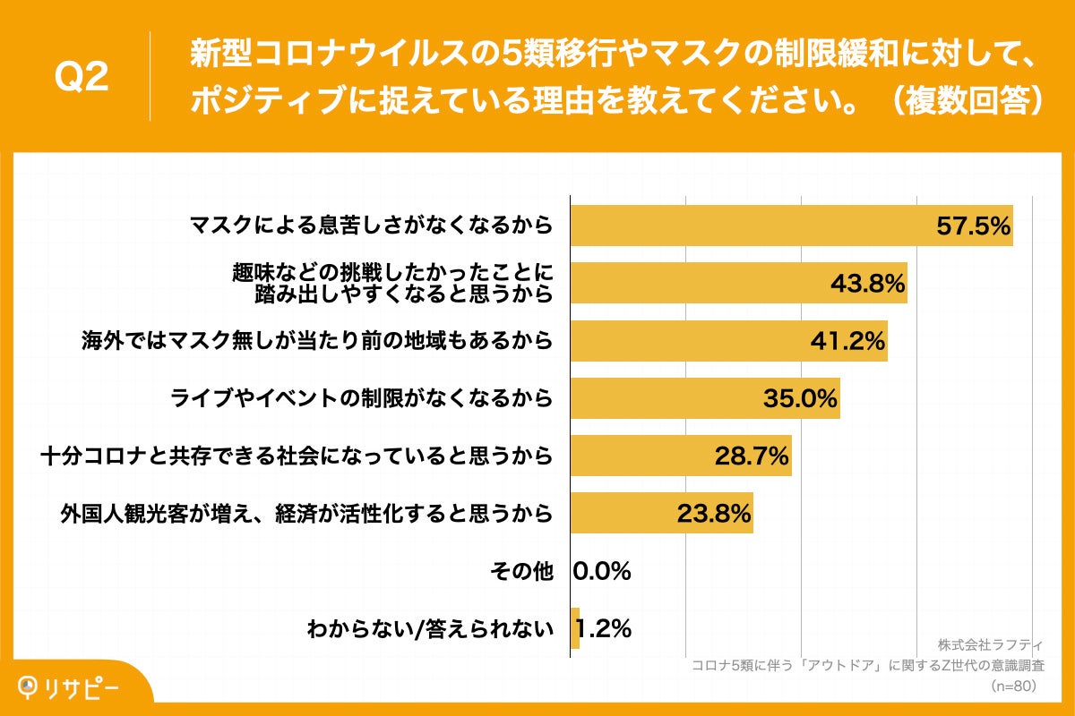 Q1で「非常にポジティブ」「ややポジティブ」と回答した方に、「Q2.新型コロナウイルスの5類移行やマスクの制限緩和に対して、ポジティブに捉えている理由を教えてください。(複数回答)」(n=80)と質問したところ、「マスクによる息苦しさがなくなるから」が57.5%、「趣味などの挑戦したかったことに踏み出しやすくなると思うから」が43.8%、「海外ではマスク無しが当たり前の地域もあるから」が41.2%という回答となりました。
