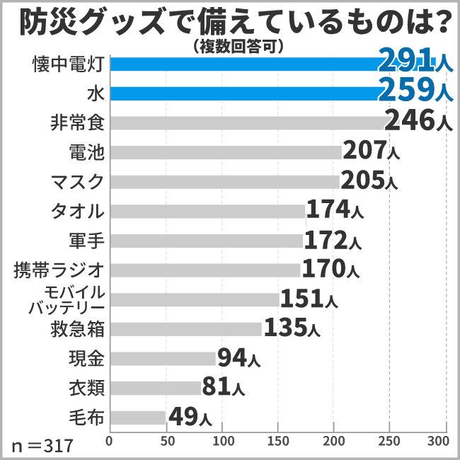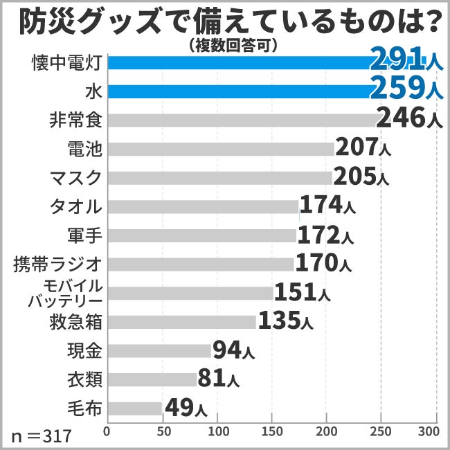 「防災グッズを備えている」と回答頂いた317人の方に「防災グッズで備えているもの」を伺いました。