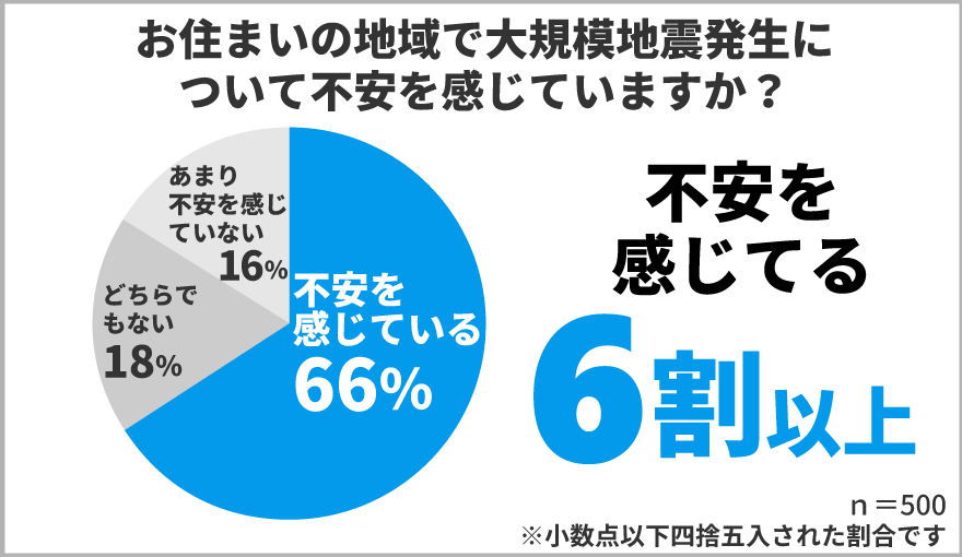 6割以上の方が現在お住まいの地域での大規模地震発生について不安を感じている結果となりました。
