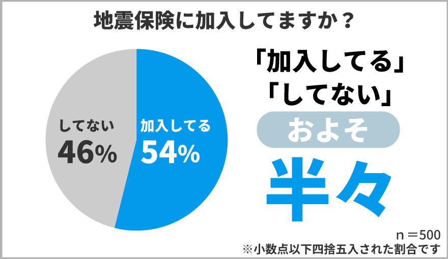 地震保険への加入に関しては、加入している方が54%、加入してない方は46%の結果となっています。